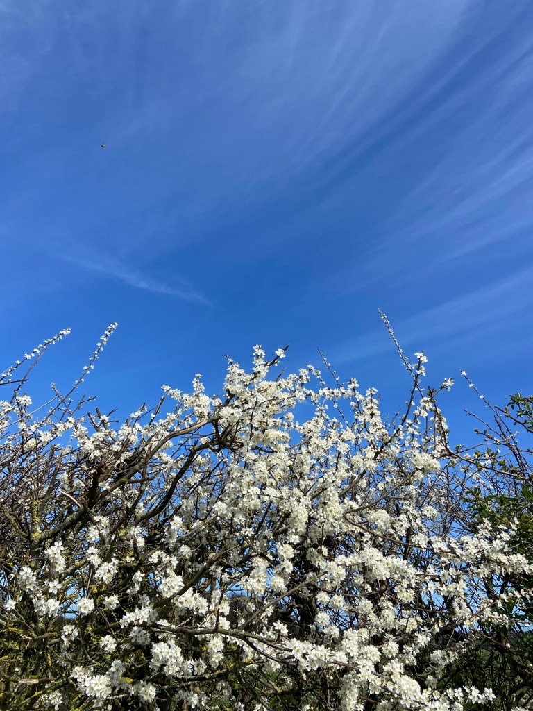 The sky was an incredible, joyous blue, set off both by wisps of cirrus clouds 23,000 feet above our heads, and also, in the few hedges that there were in the vast fields, by the white flowers of blackthorn.