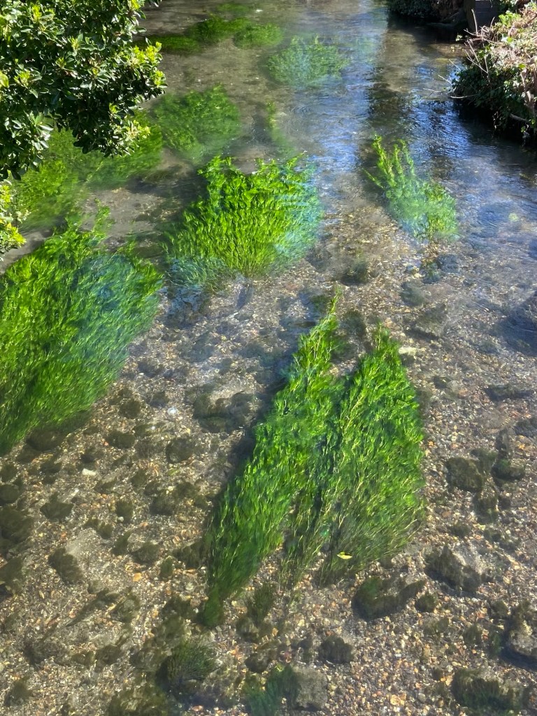 We were both surprised at what a green path the Via traces through the city, with magnolias bursting into flower and the not-at-all River Dour, water crowfoot tresses waving, flowing crystal clear through the middle of it.