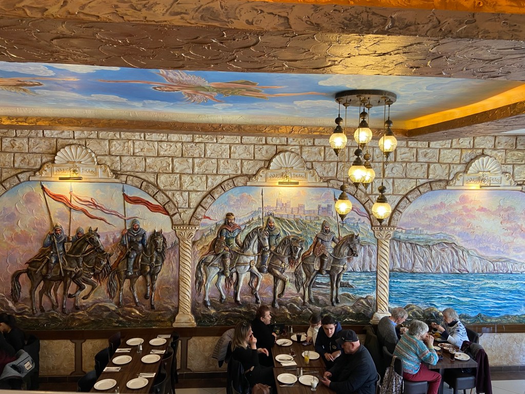 It was now 1 o’clock (such early finishes!), and Mr. Google had helped us identify a promising restaurant in which to eat. A Turkish place: Aspendos (‘We call it Asbestos!’ said Lindsay). It turned out to be a fabulous place. We apologised about our dishevelled appearance and were told not to worry, but were nonetheless ushered upstairs to an out-of-the-way table, but one which accorded us a grandstand view of the plaster mural coating the whole of the south wall. Crusaders with the castle and white cliffs as their backdrop — or perhaps (given that this was a Turkish restaurant) Saracens in cunning disguise.