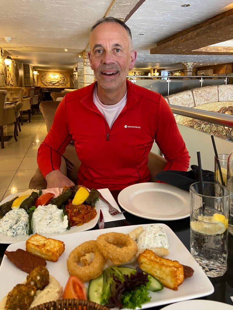although Stephen, peering over the balcony at the gigantic piles of mouthwatering kebabs being delivered to the tables below, felt he might be missing out.