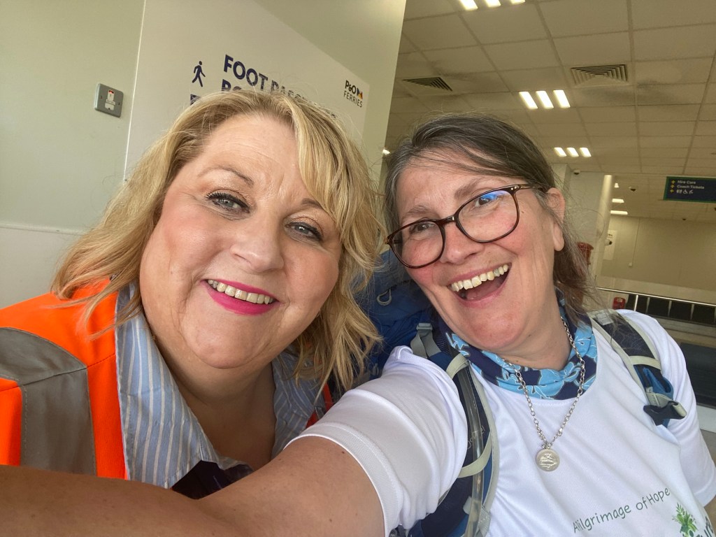 We arrived ridiculously early into the vast cleanliness of the Foot Passenger Terminal. All the documentation said that car passengers could arrive no less than an hour before departure, but foot passengers (obviously very much more administratively burdensome) had to be there no less than 90 minutes before the sailing. Emma at the check-in was a right laugh and I wish we’d been able to chat all afternoon. Absolutely nobody but you mad pilgrims travelling on a Sunday afternoon she said, as we looked in bafflement at the empty concourses. She brandished her P&O stamp with alacrity in lieu of the missing St Mary’s one, so I didn’t get a stamp in Dover after all. Emma and Stephen had plenty to say about education, and spoke as one mind on the subject, agreeing that they should go on Question Time to pontificate. Emma also had the distinction of being the first person in the history of the world to scan the QR code on my natty blog sign, which had been tied securely to my backpack, until my backpack expert managed to rip it off by heaving it into and hauling it out of the luggage racks in the trains on the way down to Canterbury. Let it not be said, though, that I wasn’t grateful for his baggage handling, and also for the fact that he has since mended it with an amazing roll of gorilla tape which he unfeasibly pulled out of his rucksack.