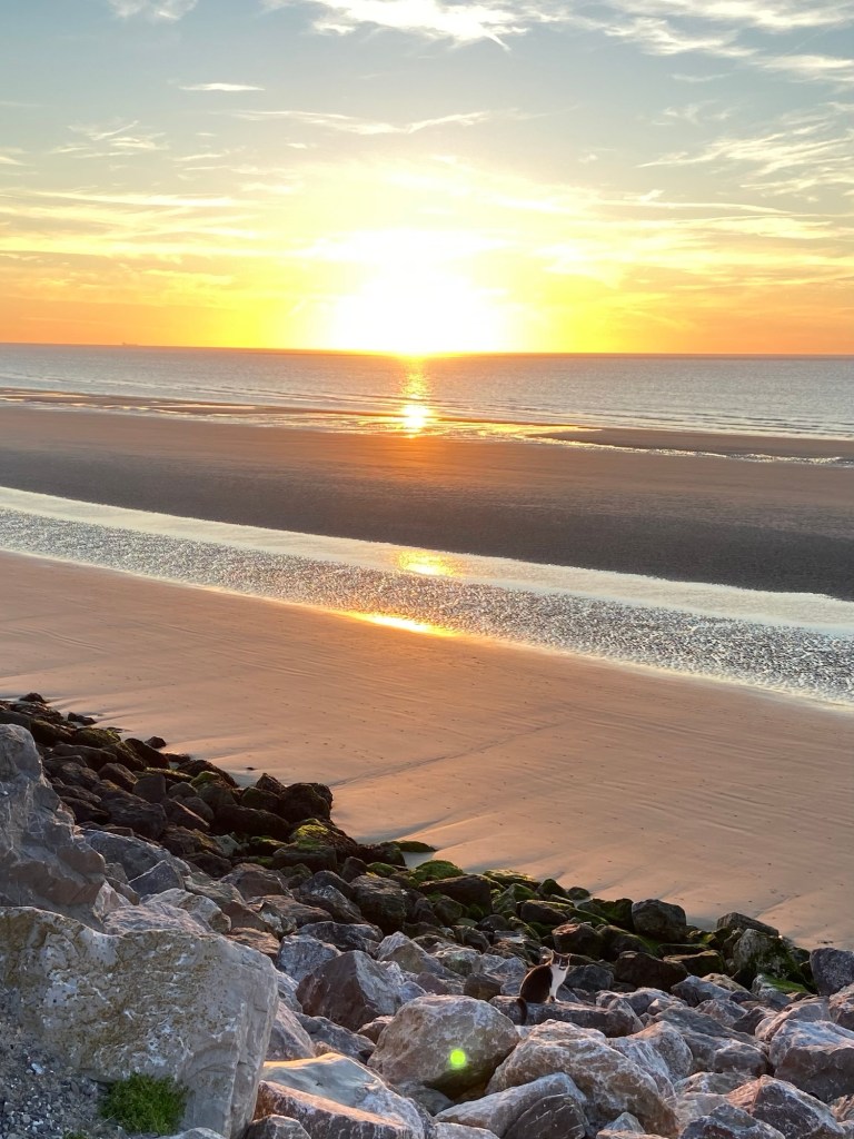 We didn’t see any wildcats either, nor cats of any kind… as I have just remembered, they were all on holiday on the beach at Wissant: when we were walking back to the car yesterday evening after having admired the extraordinary sunset, a white cat shot across our path onto the huge boulders which are the French coast’s ubiquitous sea defences. When I went to photograph it amongst the rocks, I saw there were actually two of them. The white cat ducked behind a rock, but the black-and-white one didn’t mind being watched as it, too, apparently appreciated the sight of the sun going down behind the sea.