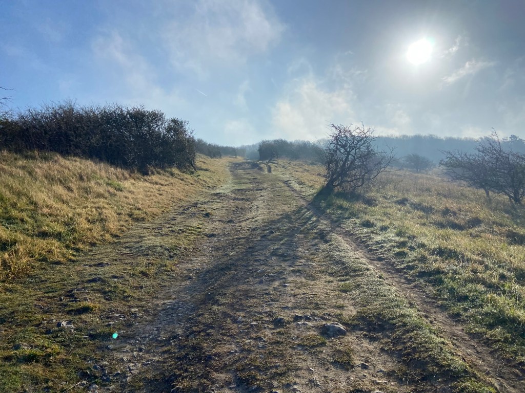 It had been a chilly 2°C when we had woken up and although the sun was shining, there was a sharp wind blowing as we set off uphill into the hazy sunshine to rejoin the Via Francigena.