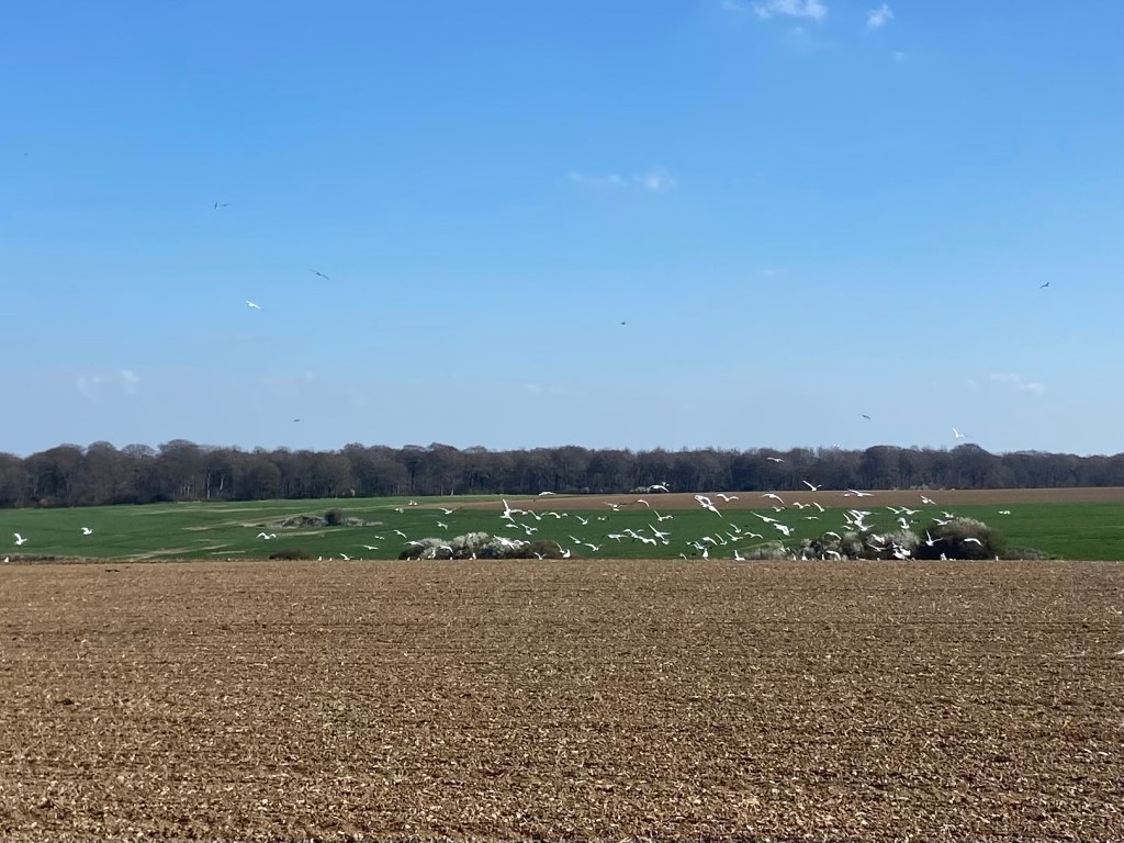 How efficient are these mega-fields at producing the wheat to make the bread of France — and how inimical to wildlife. Tractors trundled up and down the fields with spraying equipment — one driver courteously stopping as he came to the end of the field nearest our track, so as not to let the wind carry the spray onto us. Heaven knows how much of the spray the seagulls were ingesting, though, with their worms.