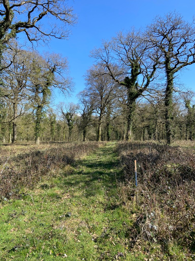 However enjoyably rapid and easy to walk the tracks over the farmland were, we were both glad when the route disappeared into the shade and shelter from the wind of the Bois du Mont, the Forêt Demoniale de Guînes. The actual route went a kilometre on a road and then did a hairpin turn back into the forest, but I took a punt on some paths that ducked sooner into the woods, that I could also triangulate with paths criss-crossing on the map.