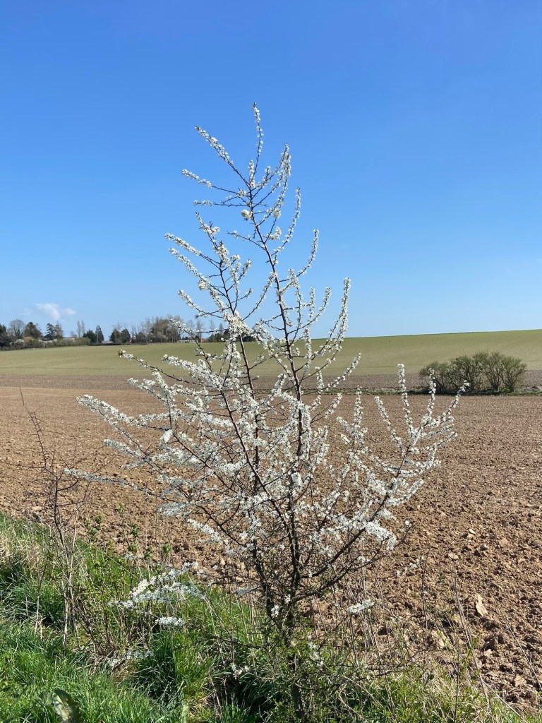 Once out of the forest we found ourselves on the road to Guînes. We were briefly back in the territory of gigantic open fields with no hedges, although on the opposite side of the road one had been recently planted up, and I stepped over the carriageways to photograph a blackthorn in full flower, a pleasing contrast to the chalk slope that was its backdrop, greening with this year’s new crop.