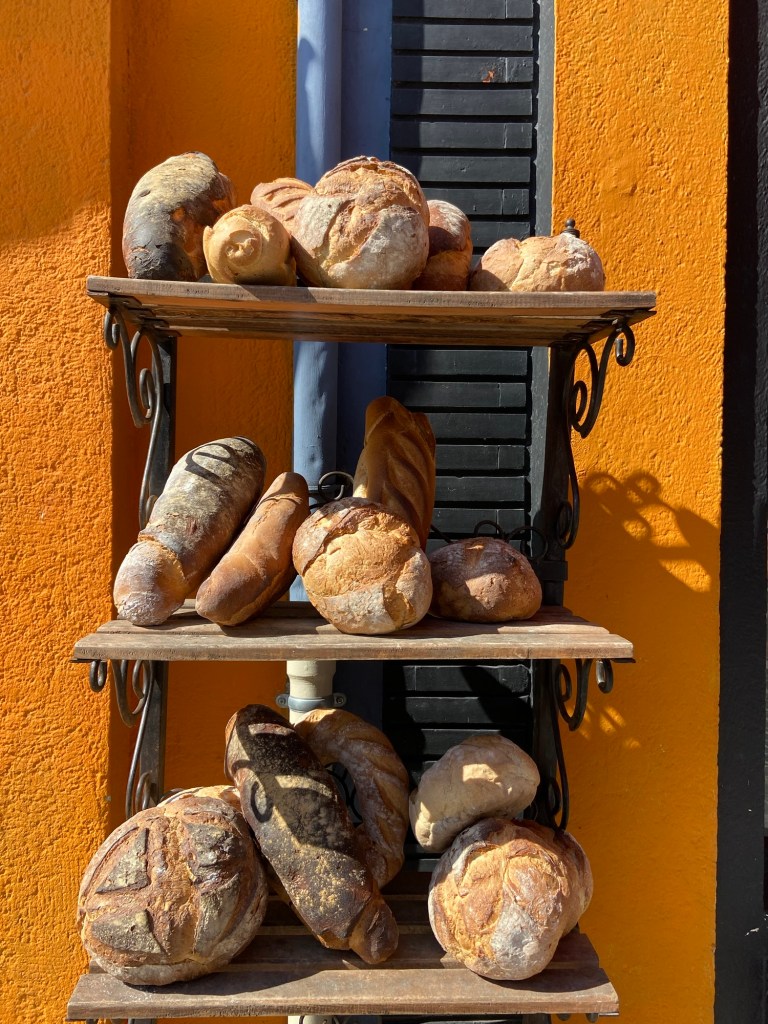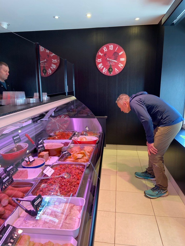 I availed myself of the fabulous shower pressure and hot water, while Stephen availed himself of the coffee machine, and then we went back out into town to find some food. A boulangerie-patisserie, a charcouterie and the Fresh Point mini-mart had us returning back to our P’tit Nid with armfuls of delicious things that my chef will creatively transform for us tonight into sausages braised in lentils with leeks and potatoes, tomatoes and a turnip (the latter is suspicious and I will pick it out of the stew). In the meantime we dug ravenously into a 3.45 late lunch: two huge croissants filled with jambon and white sauce, with grated cheese on top, that we heated up in the oven.