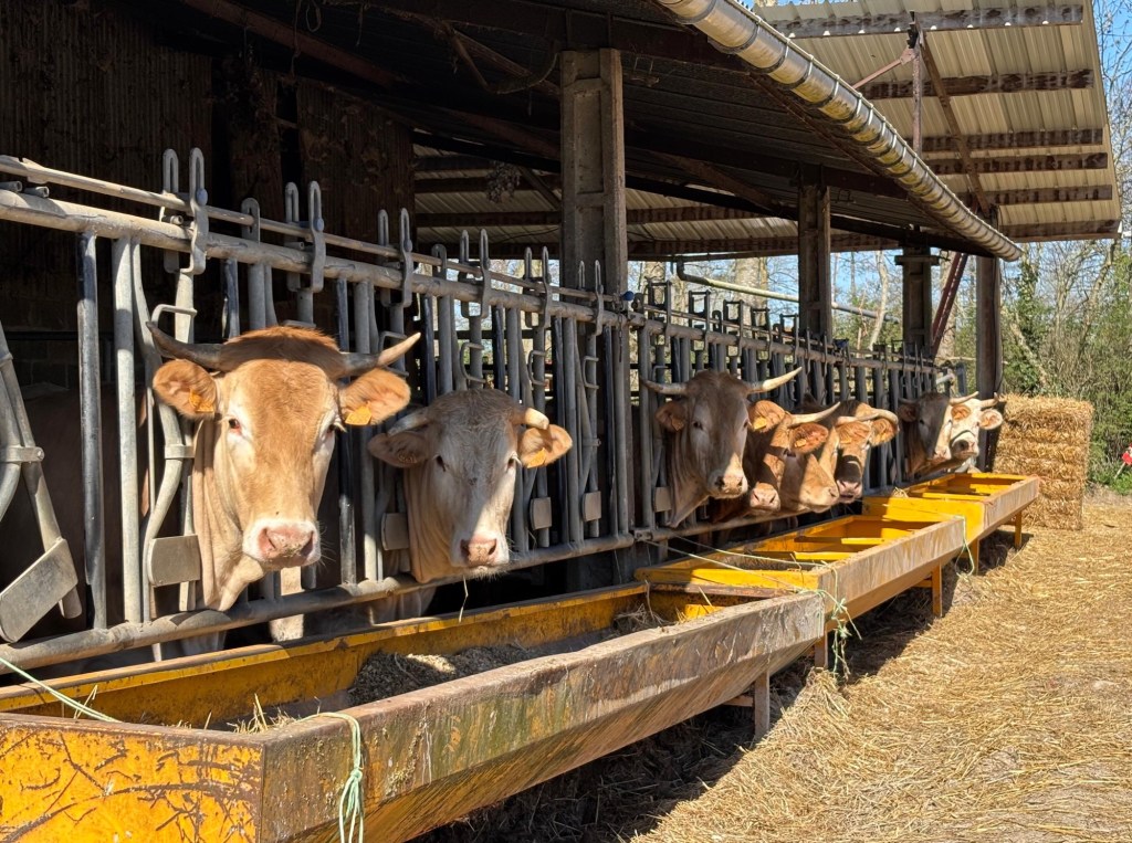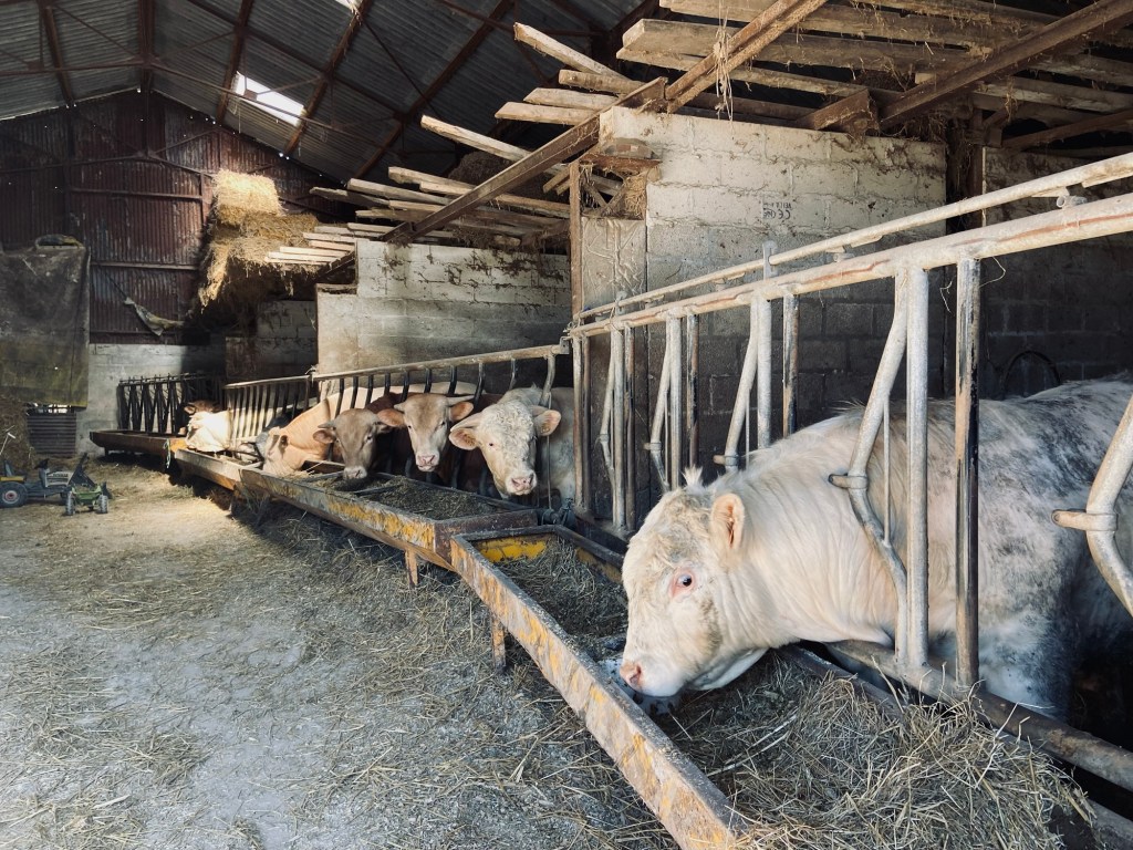 and while I was talking to Ludovic in his Sunday best (who told me the chateau was disappointingly happily inhabited) Stephen was just inside the barn talking enthusiastically to Ludovic’s wife Aline, the daughter of Monsieur Gotrand the farmer, about the most beautiful sight of the trip so far which literally made me gasp: shafts of sunlight streaming into the barn illuminating hay bales and a perfect line of Charolet and Aquitaine bulls. They were beautiful and gentle creatures (and behind the bars of their troughs!), snuffling at us and licking each other.