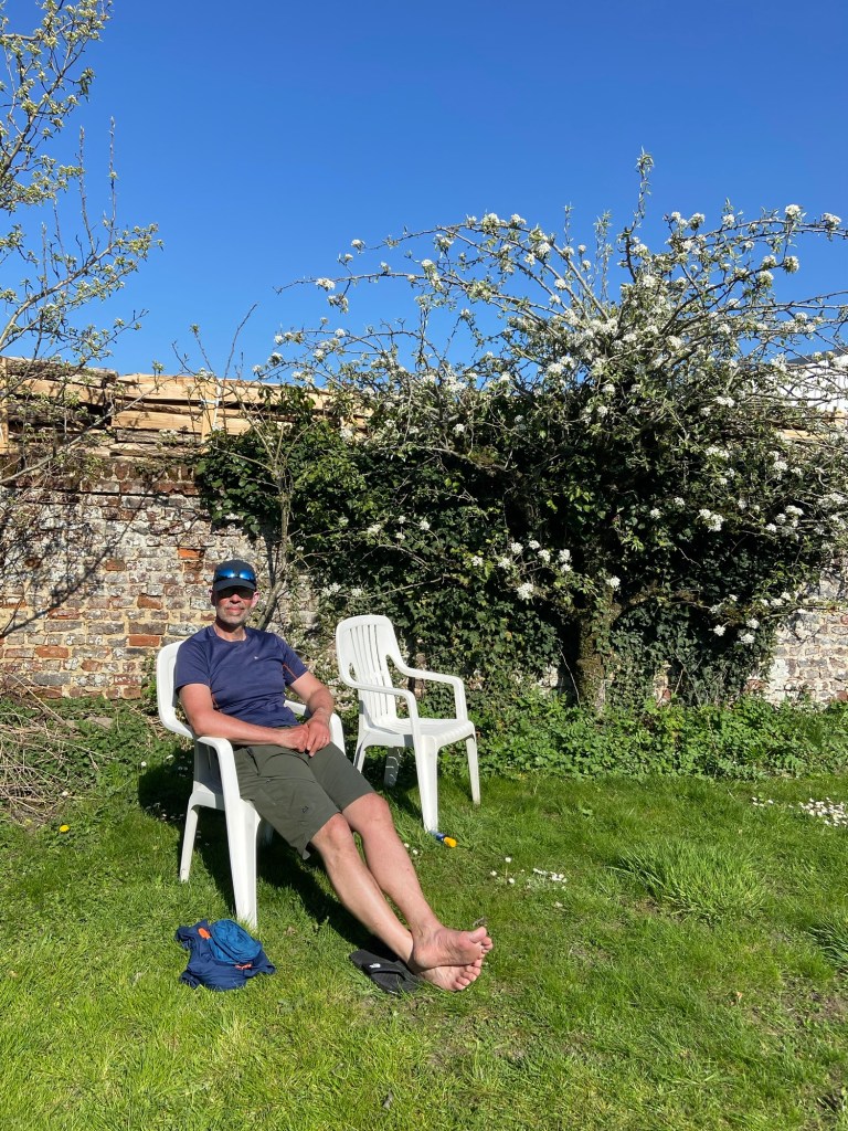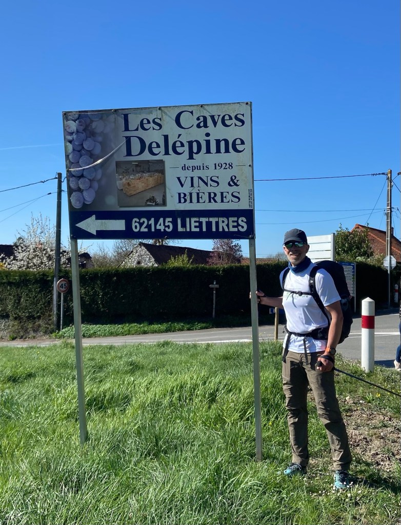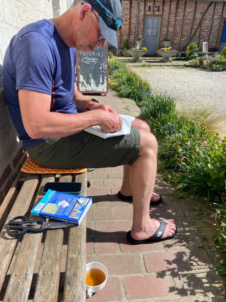 Speaking of 40km, Matt arrived in the gîte. He’d walked a monstrous 40km from Tournehem today and actually fallen down a manhole half way along. He’d ended up with one leg thigh deep in the hole and had cuts and bruises. Horrific!