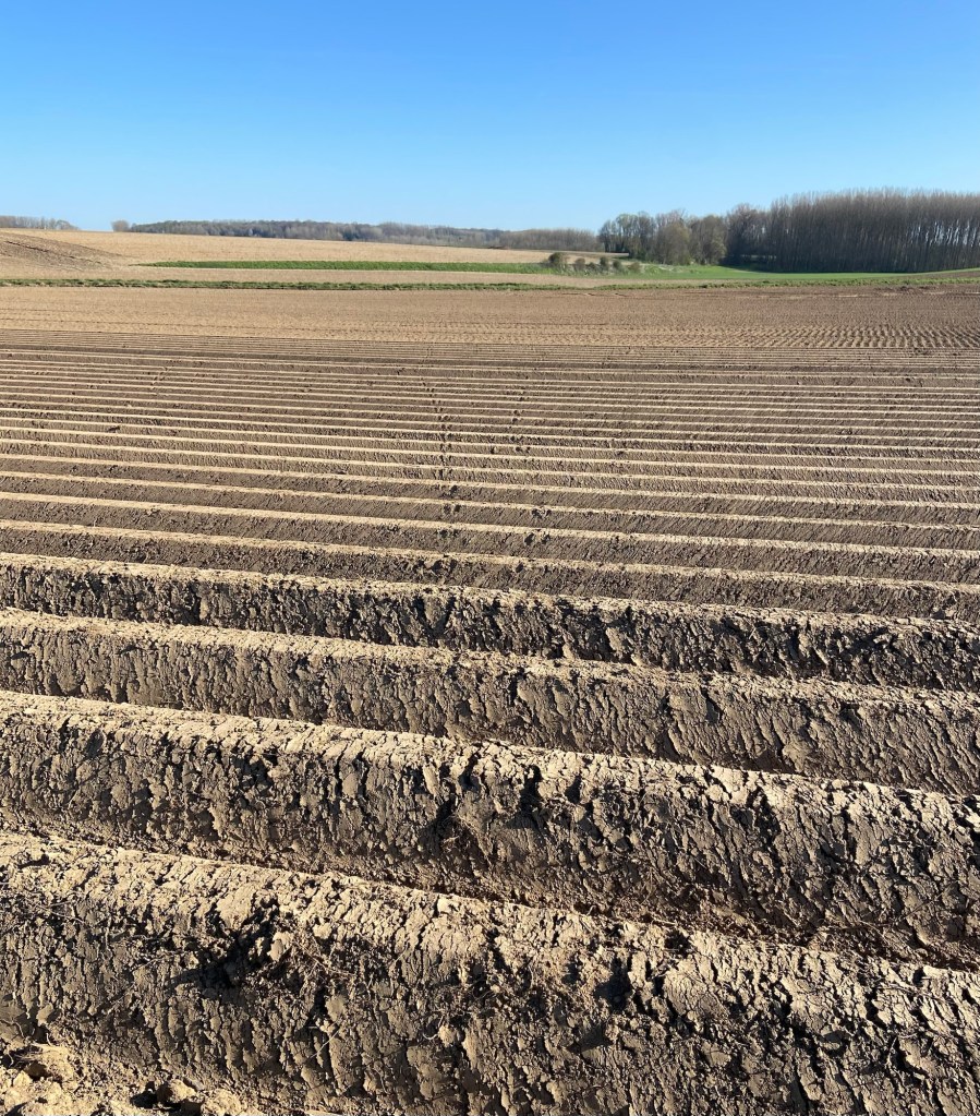 As you know, most of the fields we have seen so far have been wheat, but a couple of days ago we did see one field of flax, and today we saw our first potato field, planted up in soil that was noticeably brown rather than grey or white. In a walker’s fever dream Stephen thought the potato furrows looked like fingers of Kitcat. I was more interested in the herringbone pattern visible in the cracked dry earth on the sides of the furrows: four sloping one way, then four sloping the other and so on. A set of deer hoofprints bisected them.