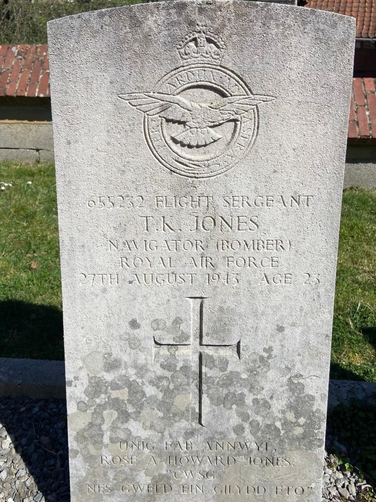 On the far side of the church in the graveyard was a poignant row of graves: the entire crew of a single plane shot down on the 27th of August, 1943. One grave particularly tugged at my heartstrings: that of Flight Sergeant TK Jones, navigator and bomber. That he had been Welsh was made clear by an inscription in Cymraig at the bottom of his headstone. He had been the ‘beloved only son of Rose and Howard Jones’ and they wished he would ‘sleep until we see each other again’.
