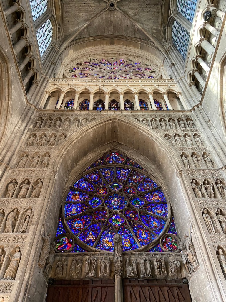 The architectural gallery of the kings, 56 15-foot high statues of the Kings of France announces that this is the nation’s coronation cathedral. They were almost too high to photograph them.