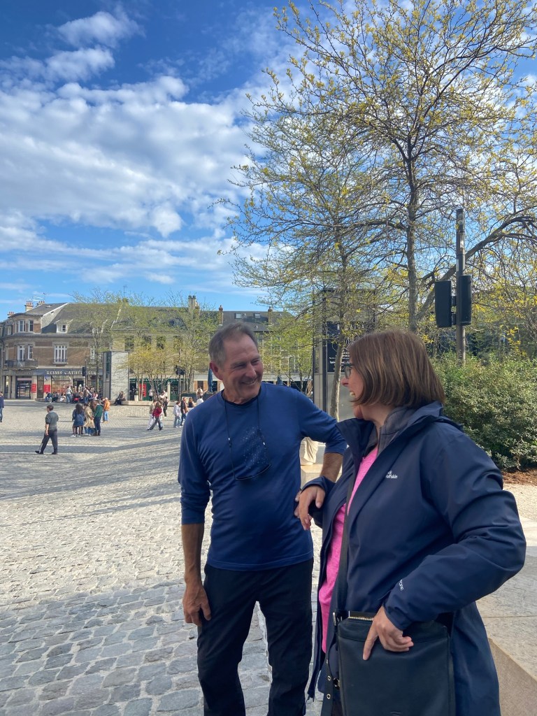 As I was bent over my phone checking I know not what, the one person I knew in Reims rushed up to me — Regine, with a bag of clean laundry was coincidentally passing by. Such a reunion!