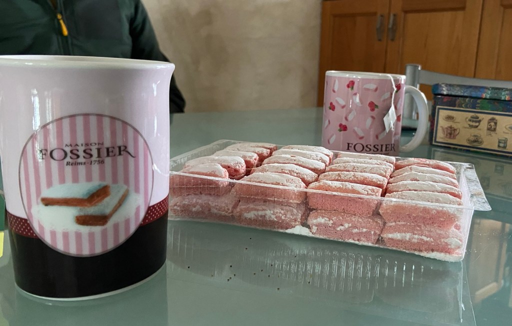 She switched on radiators around the place for us to dry wet things on, found me two bin bags for my onwards journey, and hung up my gilet against a tower radiator. By the time we came downstairs from sorting ourselves out she had hot tea on the table — and rose biscuits, a Reims specialty, for she herself is Rémois.