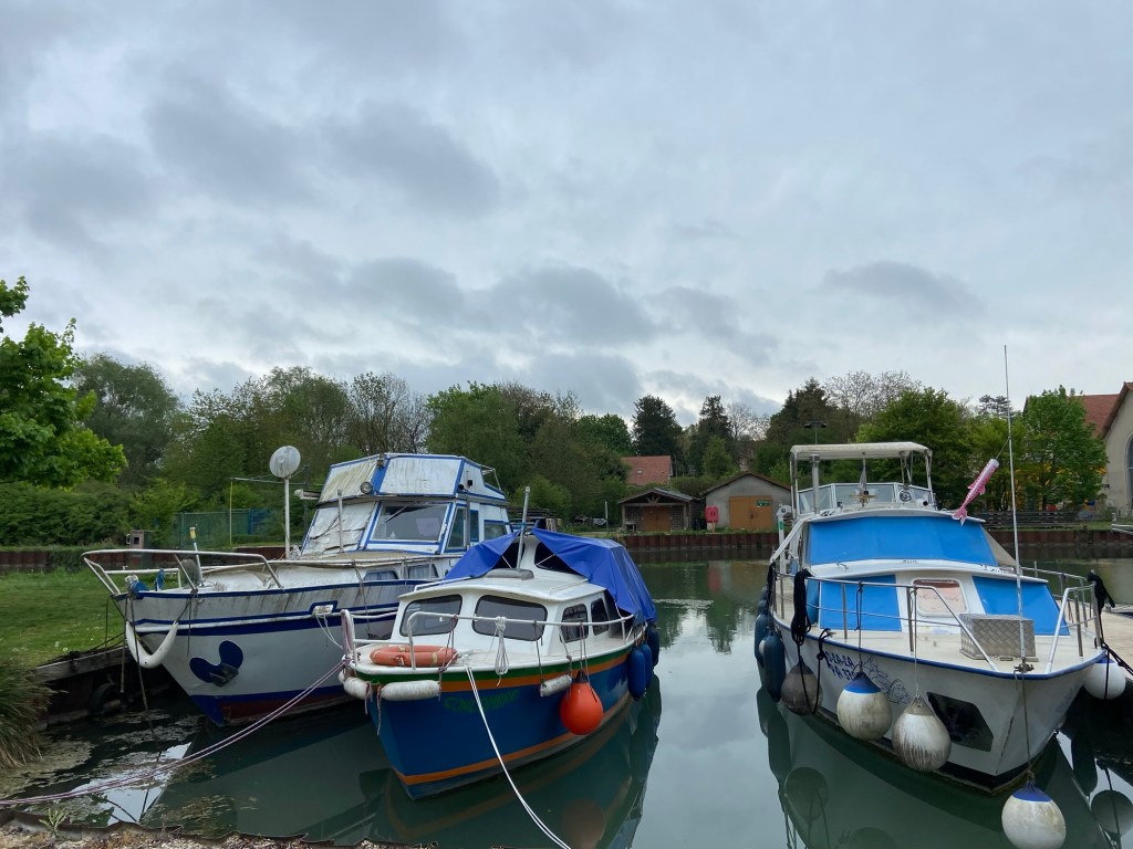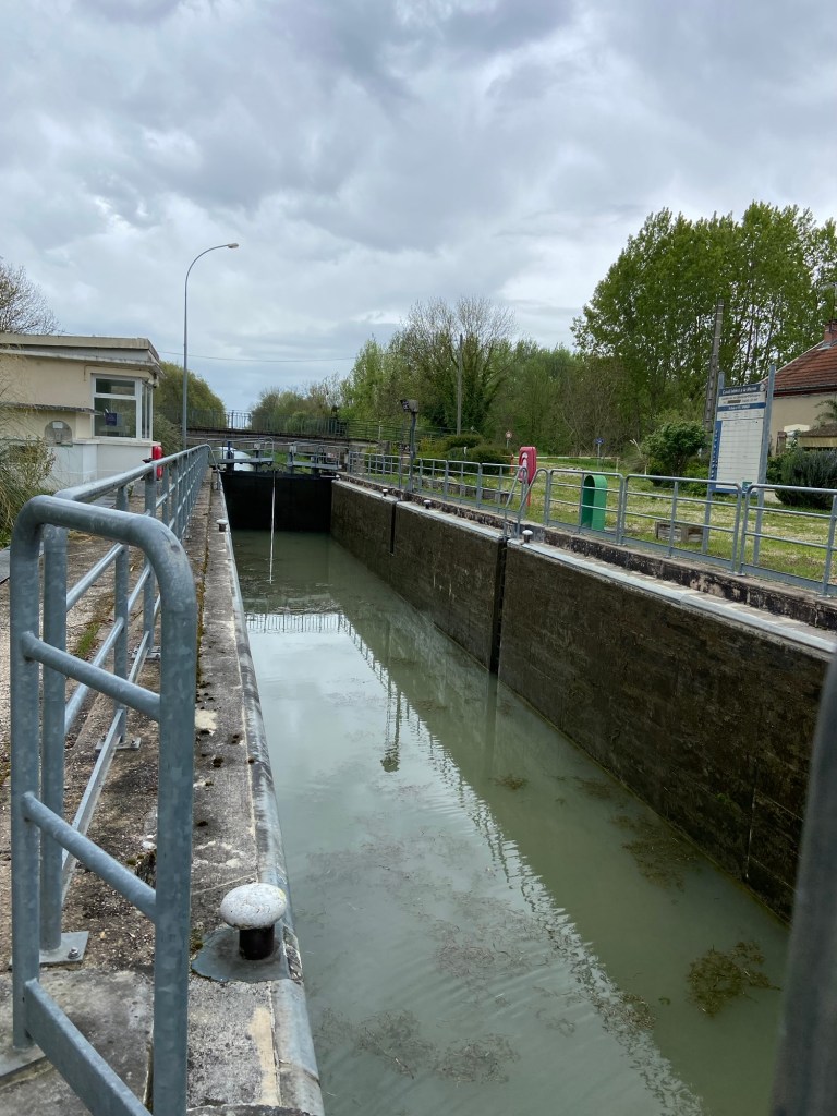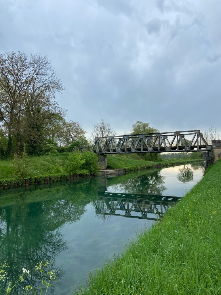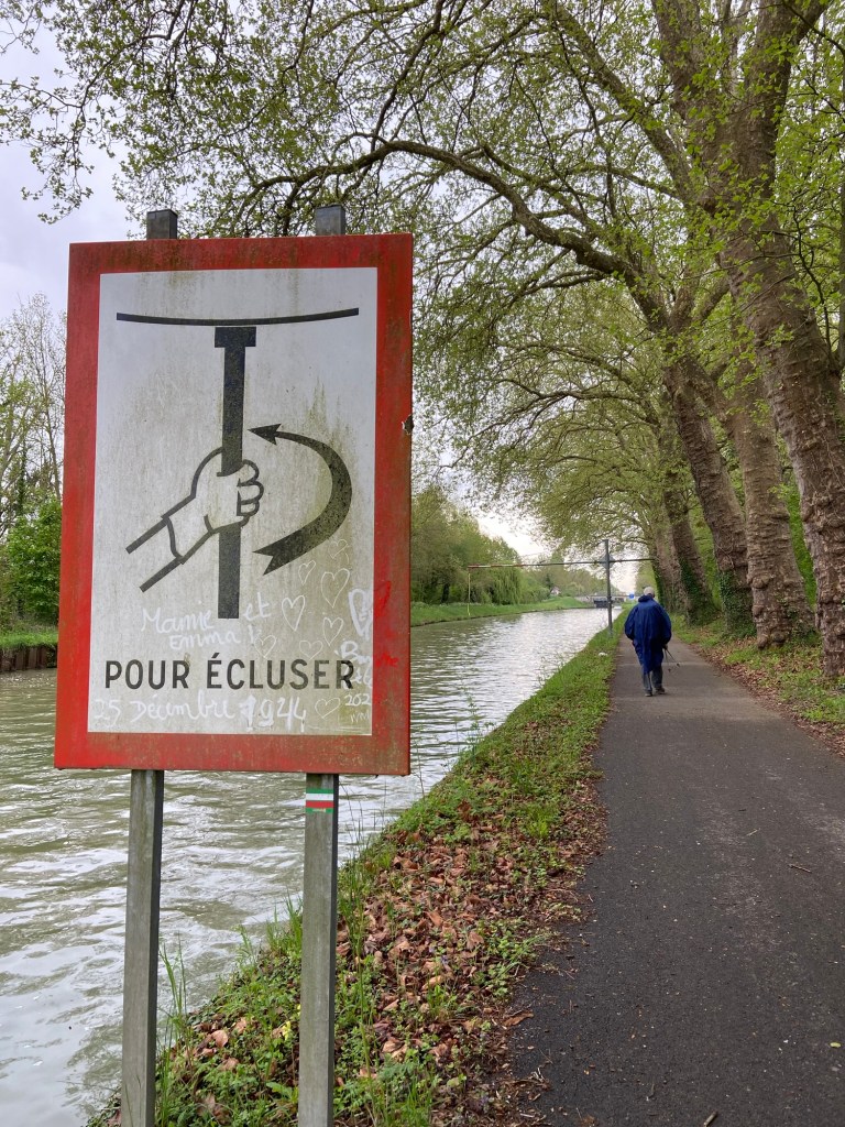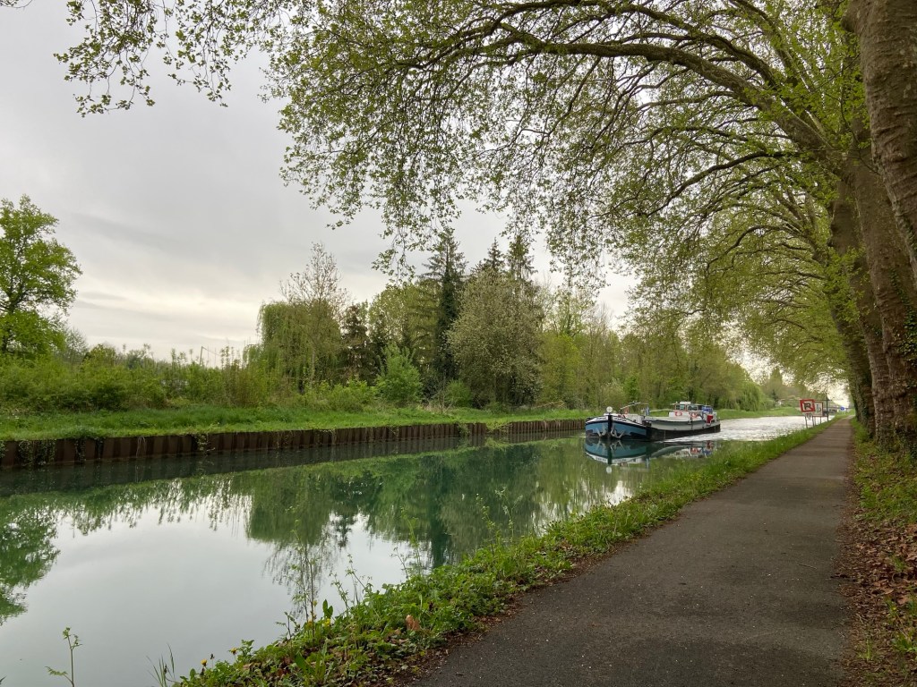 The forecast for today was, after twenty-four gloriously dry days, for rain. I hadn’t bothered looking at Apple Weather because it had been so inaccurate in recent days, but over breakfast Ian showed me a radar picture on his phone which showed a slow moving band of rain moving over the whole country, due to hit us at about 10.30 as we walked out of Condé and straight (very straight!) along the canal to Chalons-en-Champagne.