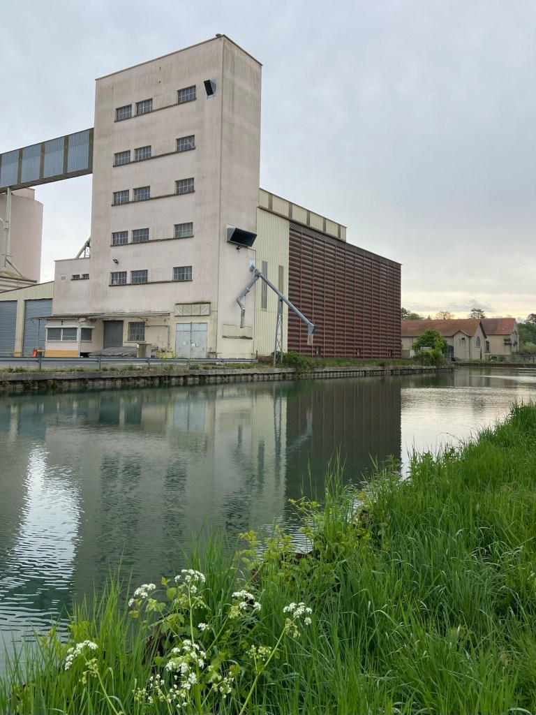 We had now left the Canal de la Marne a l’Aisne and joined the Canal Latéral à la Marne. The basin where the two joined was a working industrial area of more grain silos beside the water. Above our heads was a feeding frenzy with a large cloud of swifts, flying low in the cooler air to work the insects trapped in the lower air masses.