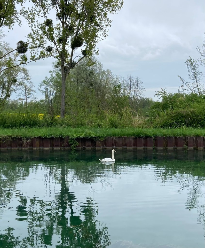 One of today’s huge haul of water birds appeared in the far distance of this exceptionally straight canal: a solitary swan.  It wasn’t particularly interested in us and the same could also be said of the way we felt about him.