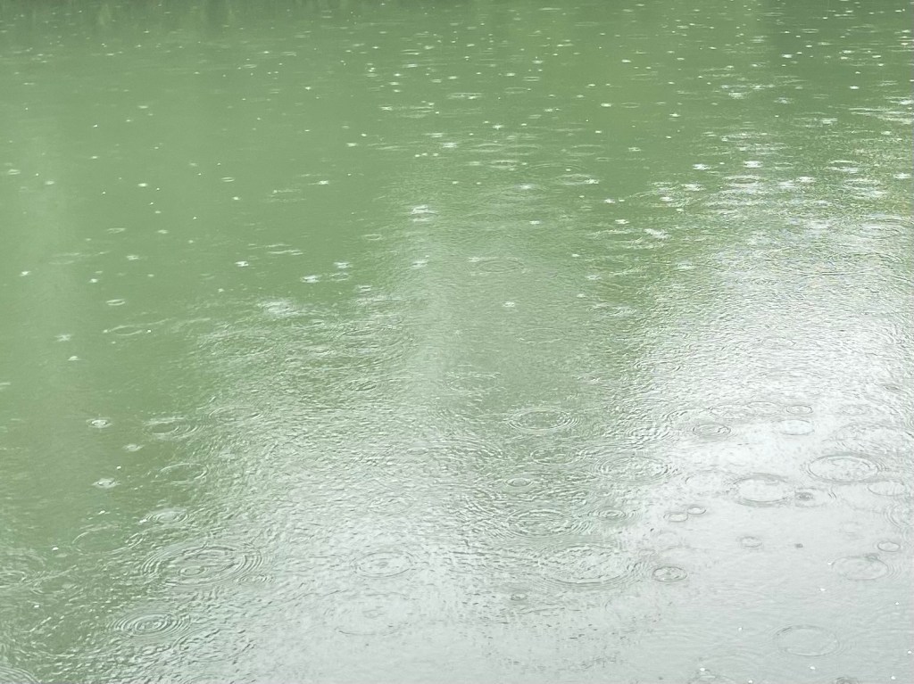 By 10.30, as forecast, the rain began in earnest. The flat surface of the water no longer reflected the trees; it was an ever-changing pock-marked green plane, although still beautiful in its way.