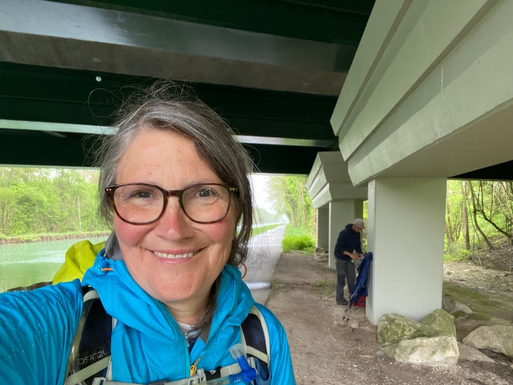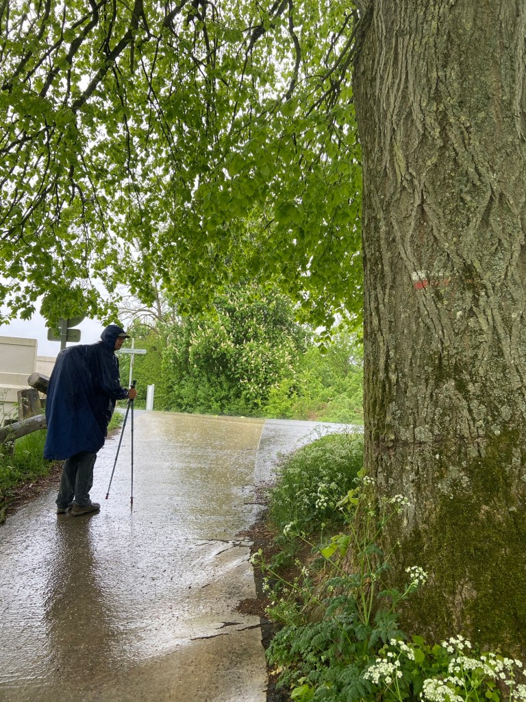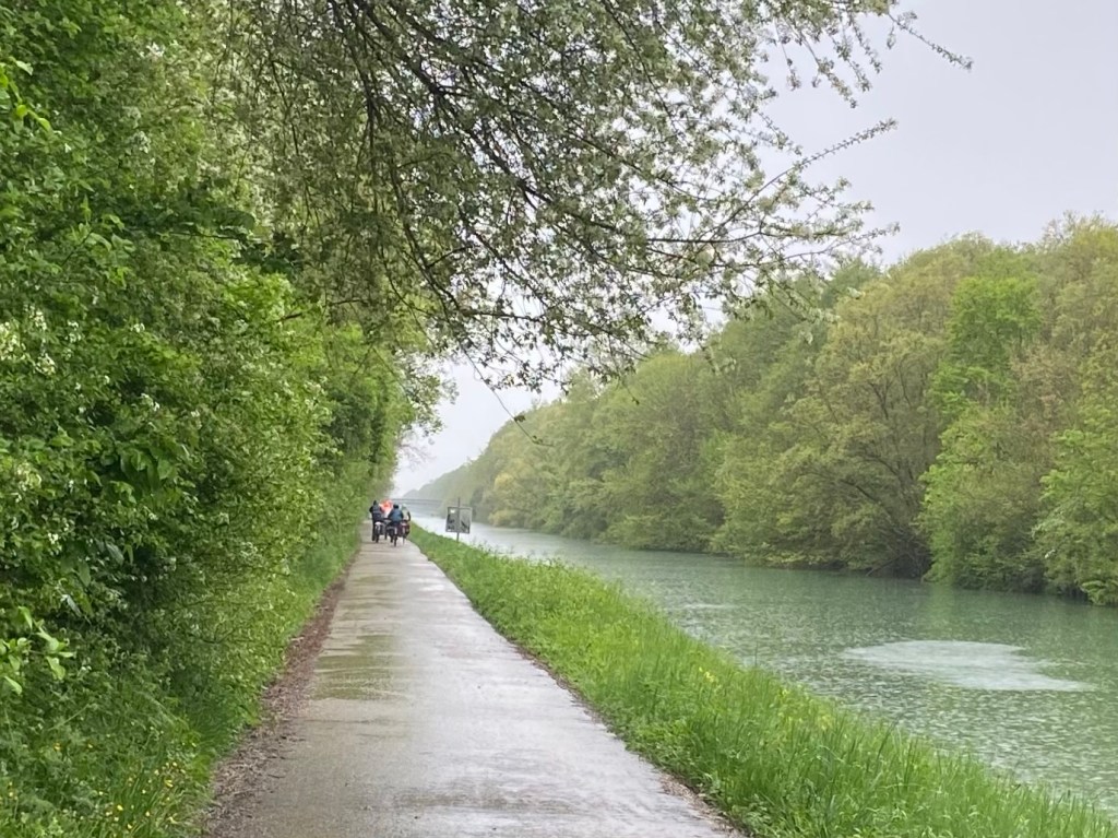 But in truth, we didn’t find this walk so bad.  For a wet day, it was so much better to be moving fast on asphalt than sliding about on chalky or clayey gravel roads and woodland paths, on a dead flat path than risking slipping and taking a tumble on a downhill slope.  And we agreed it was better to be doing two hours of this with good company than such a monotonous walk on our own.
