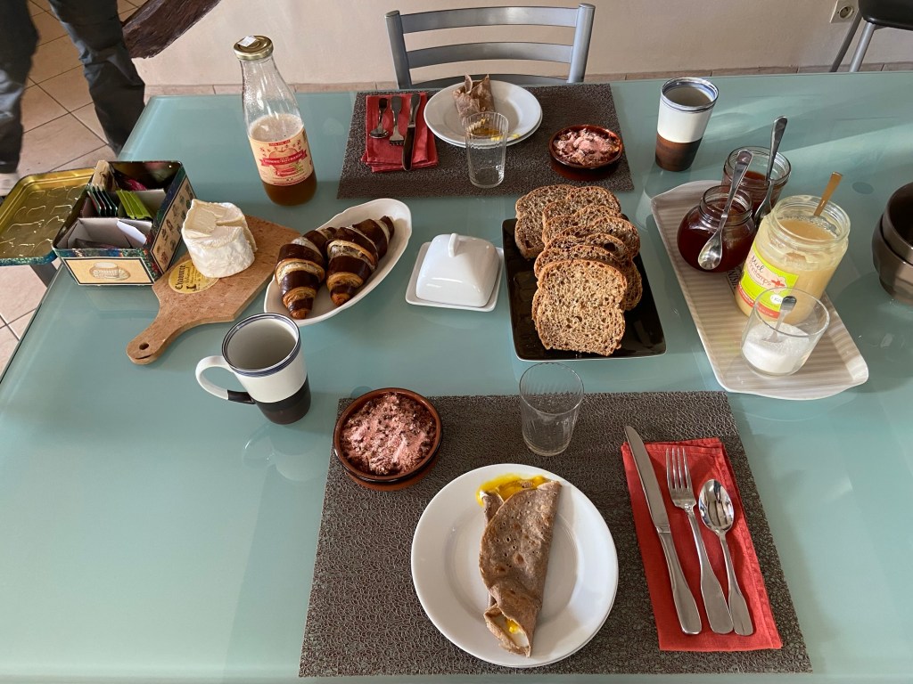 We could almost not believe our eyes when we saw the breakfast laid out for us this morning. There were freshly made buckwheat crêpes with an egg inside (at least, I think they were buckwheat: Mme Monique said it was ‘Saracen’ grain. There was also a little pot of strawberry crumble with the rose biscuits crushed and dusted on the top, bread, butter, and jam. There was fresh coffee, and local, farm-made apple and rhubarb juice. Not to mention the chocolate and cinnamon croissant, the likes of which I have never seen. I nibbled the end of this last, decided I couldn’t eat another thing, and put it in the pocket of my rucksack to have for lunch.