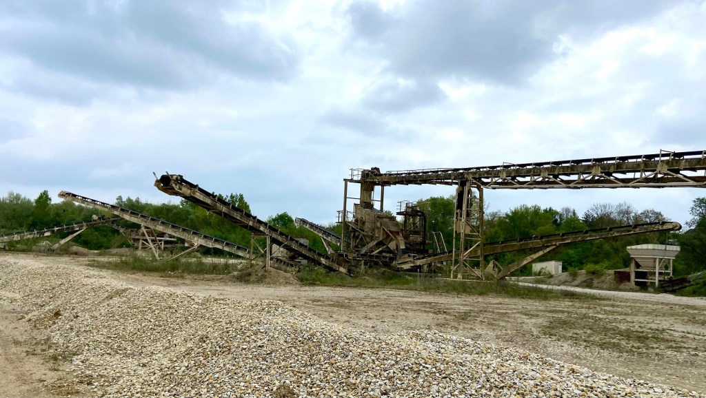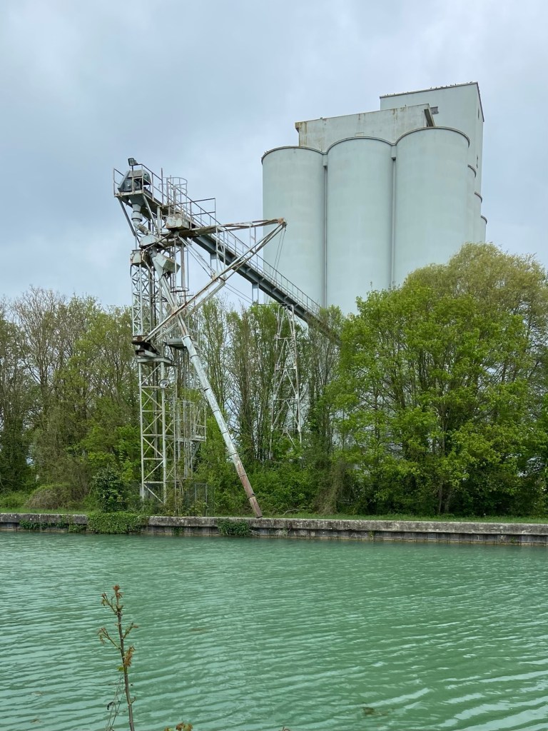 Sogny Mills was a slight detour off the route to find somewhere to sit. I perched on a low wall in the graveyard of the church and gave my feet a little break, swapping over my socks and trying to adjust things to make it a bit easier for the little toe on my left foot. I wasn’t very sure about where I was in the arc of the day’s walk because I had racked up quite a few kilometres meandering through Chalons and couldn’t work out how much of the actual route I had done, but I thought I would press on anyway, feeling that there was now quite a way to go. I took a shortcut through the old sand works on the other side of the river, now a graveyard itself, of slightly spooky conveyor belts, looking like an old set for Star Wars.