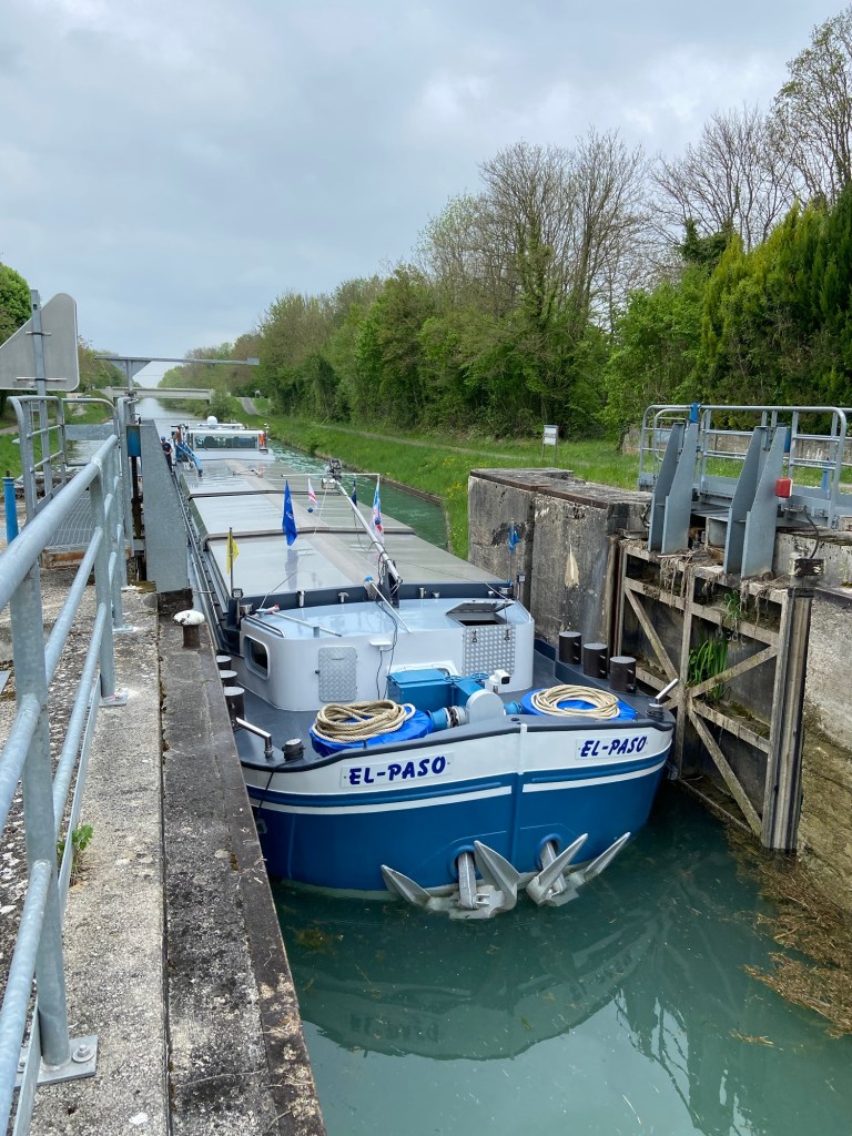 I had noticed as the boat was below me in the lock that the hold was empty, so after it had gone I asked the lock keepers what cargo the barge l was going to pick up. They shrugged in Gallic fashion but one suggested it might be going to get grain, and another that it was going to get bobbins — those huge great big cotton reel things that they wrap cables around.