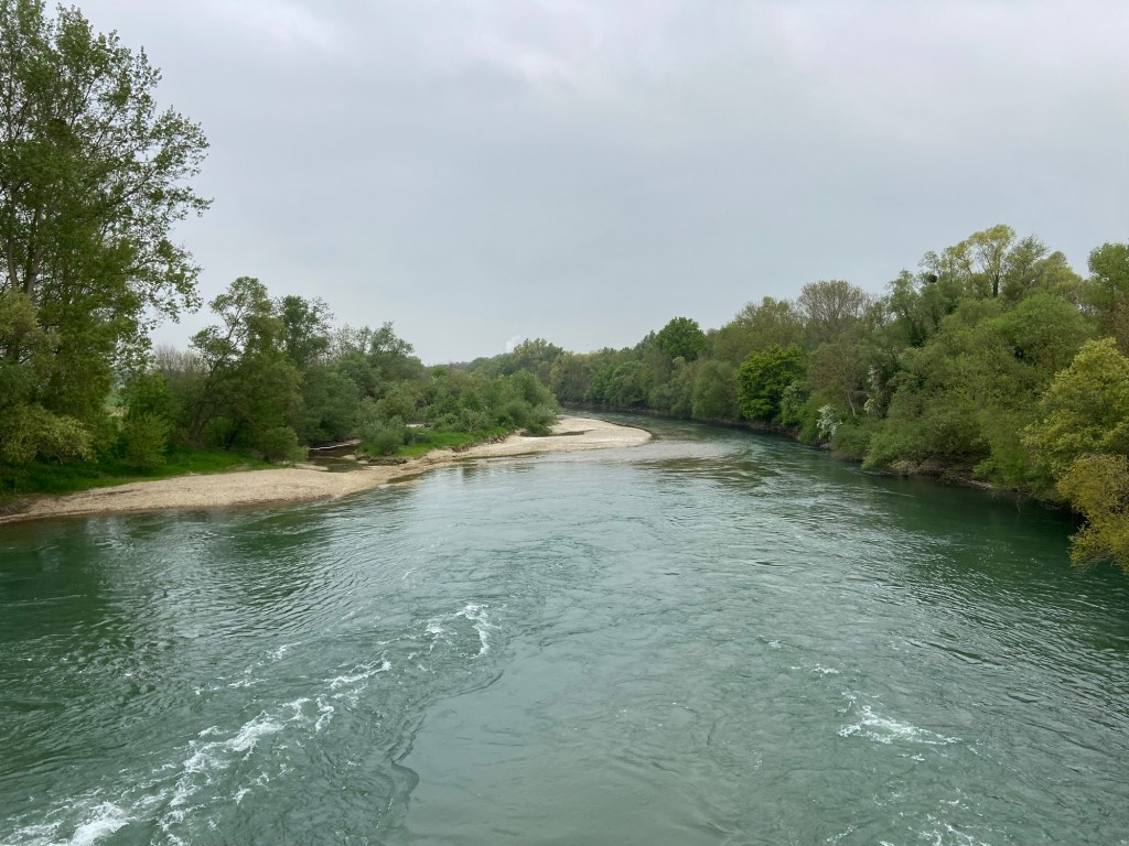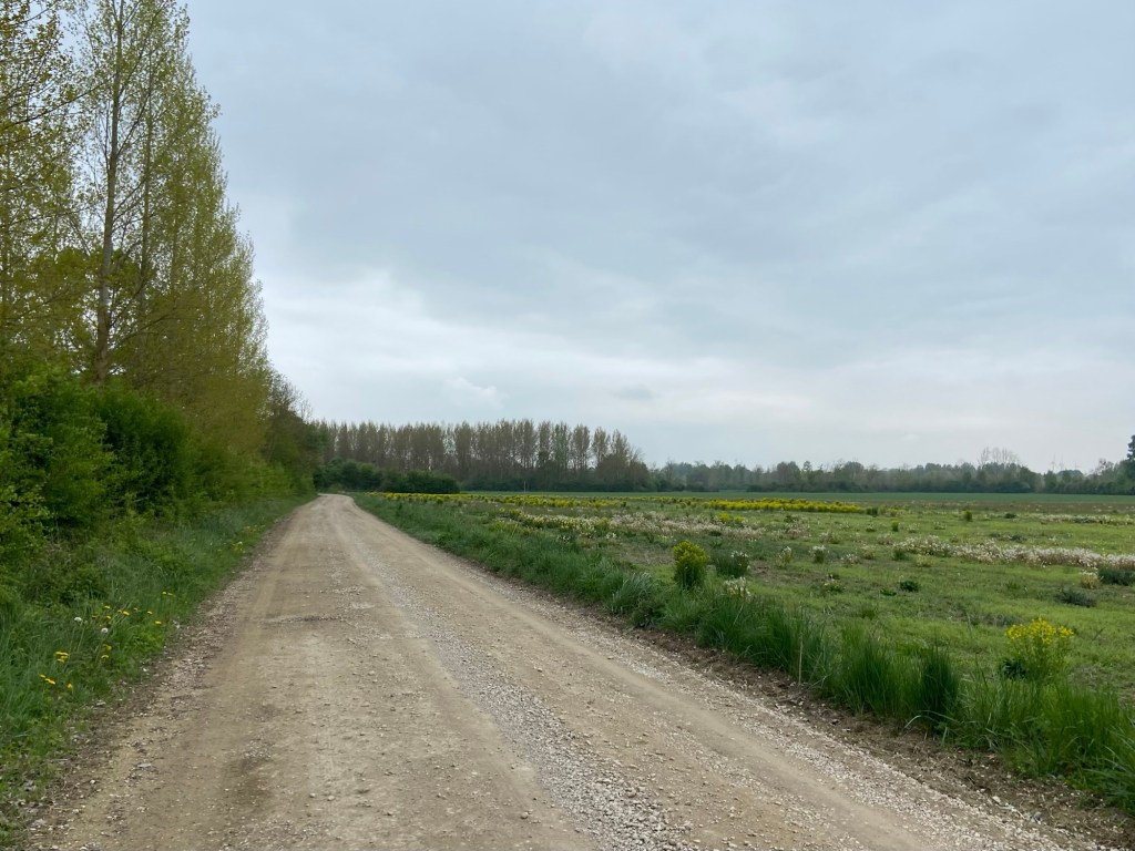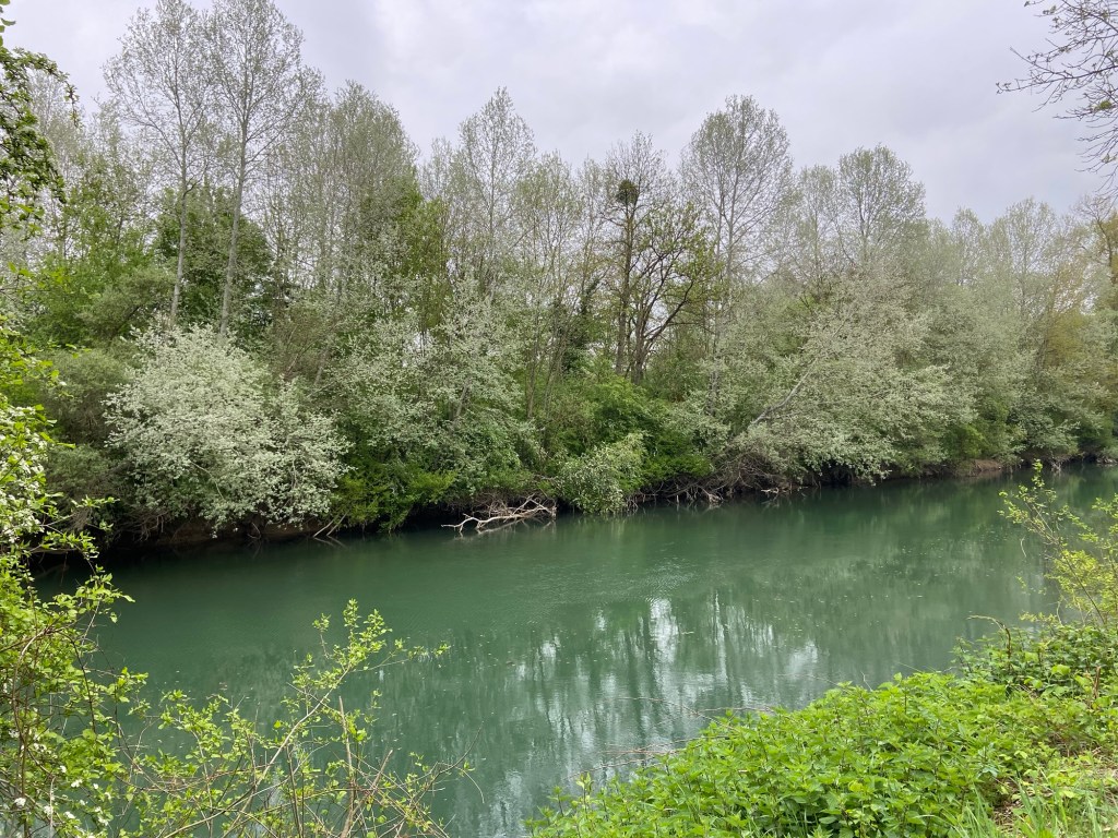 Larks and corn buntings were making merry in the air and on the ground hidden amongst the crops, joined by tree pipits and some extremely noisy jays as the Francigena picked a path around patchworks of woodland. Listening to the gratingly harsh calls I could understand why the jay’s Latin name is Garrulous. The river here was wide and shallow with willow-lined gravel shoals, although past floods had cut deep cross-sections into the banks where the water flowed fast on the inside of bends.