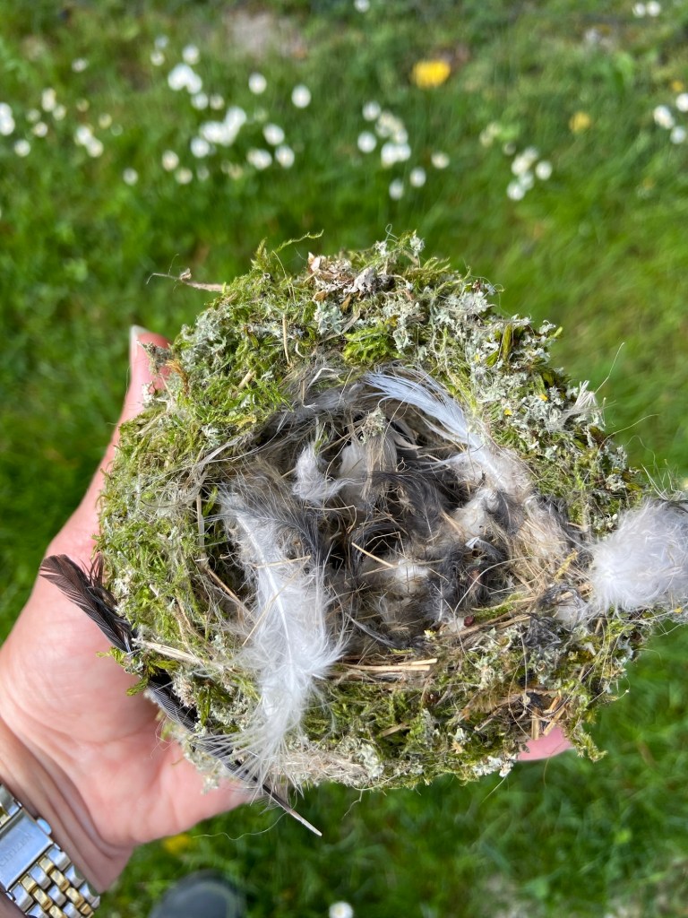 On the ground I found a nest, seemingly one of this year’s, with bright green moss and new feathers packing the inside. I don’t know what bird it was that built it, and couldn’t think how it came to be lying there on the mown grass.
