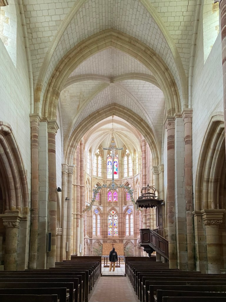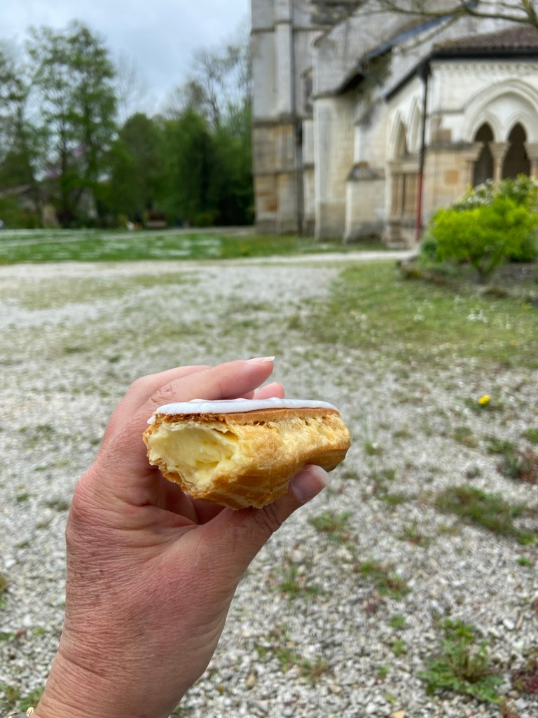 I repaired to an outside bench with a view of the cloister-porch to eat my Magnificent Éclair and ask myself why anybody would eat a croissant when something so comprehensively delicious is available in every boulangerie’s adjacent cabinet.
