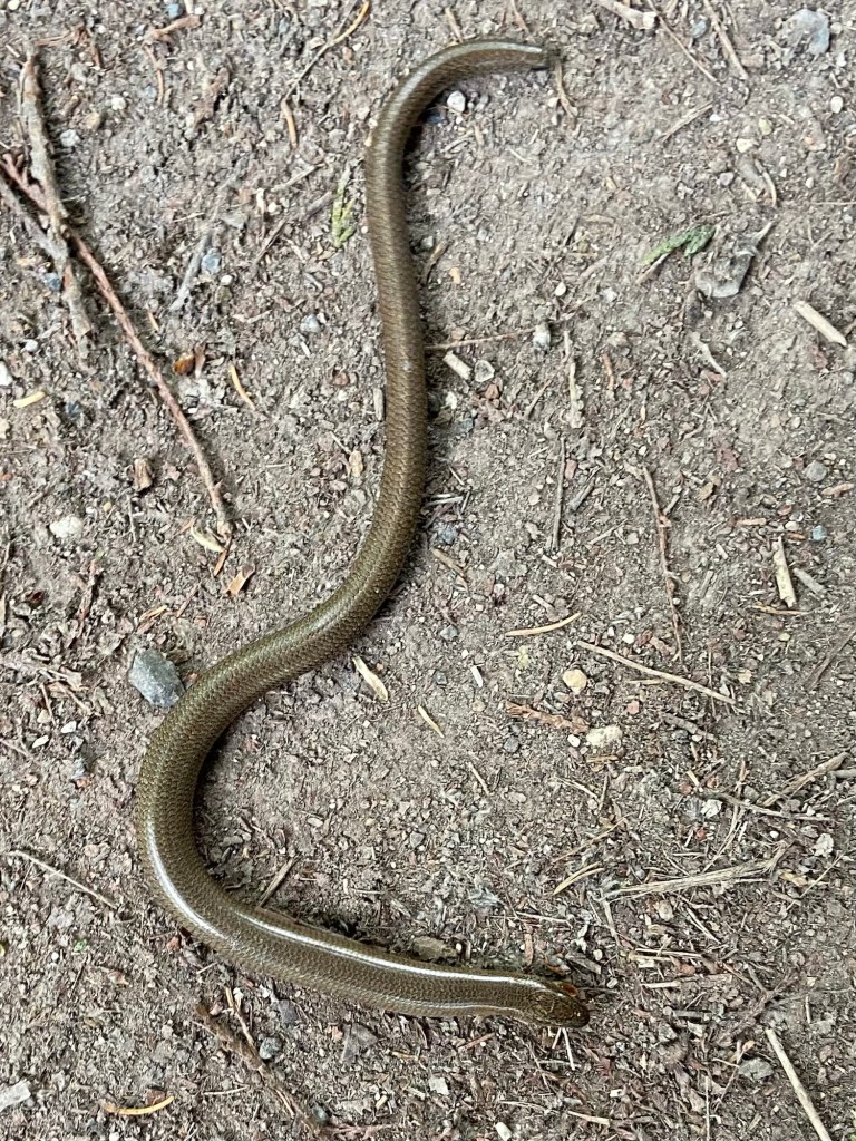 The warmth of the chalky soil had brought out a slow worm to bask. Its Dutch name is hazelworm, which I subsequently discovered is also a regional name for it in the UK.