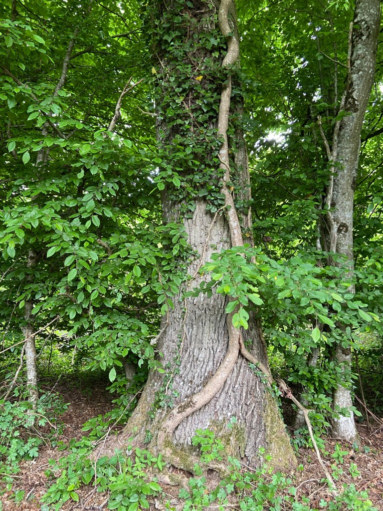 and handsome oaks were being parasitised in triple-slow forest time by vigorous ropes of ivy.