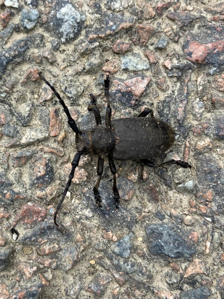 Also on the tarmac was a longhorn weaver beetle, Lamia textor.  I’m not sure why it and the hornet were on the ground and so obligingly easy to photograph. But I was glad to see some of the otherwise invisible inhabitants of the woods.