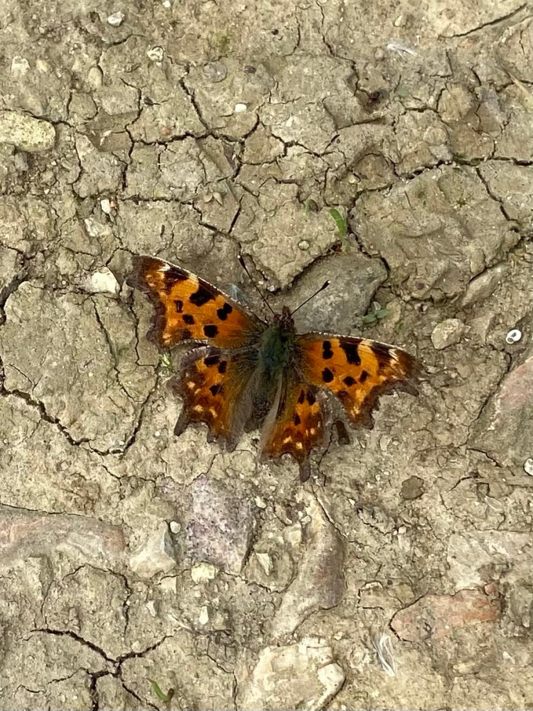 It was about another 4 km to my lodging at the end of the day, and most of it was a grassy path over farmland. Butterflies had begun flying again after their cold wet downtime days, and commas had now started to appear, their frilly edges standing out against the baked earth.