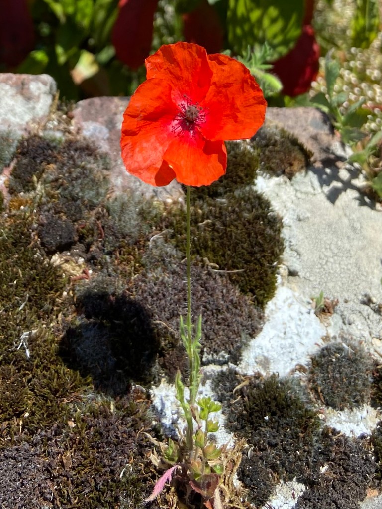but filled with little surprises such as red poppies sprouted from seeds that had germinated in the moss and crevices of a dry wall,