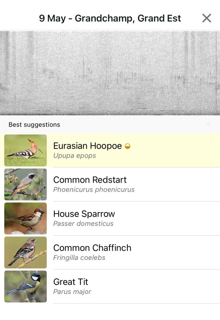 Out in the street there were no signs of yesterday’s bees, but the odd birdsong that I had heard yesterday started up again.  I had my suspicions confirmed when I went down to the river and put the Merlin app on the case. The birds that I had seen yesterday and thought were jays and the regular whoop whoop whoop noises were being made by HOOPOES.