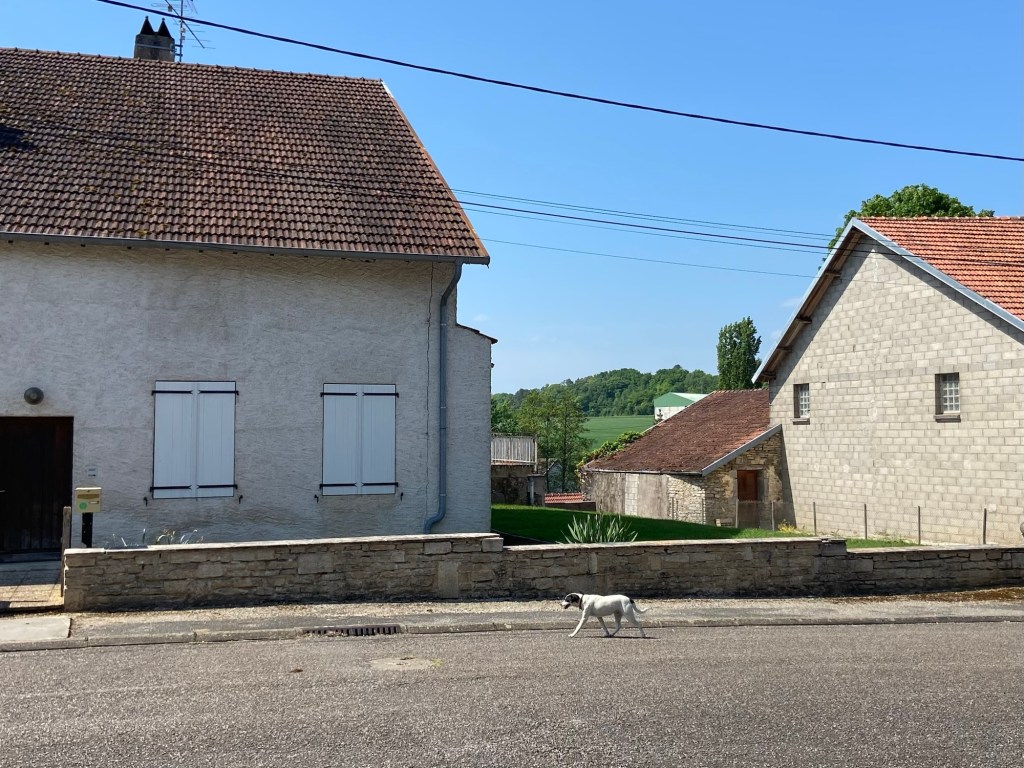 I met the dog again right at the end of the village before my path took me out into the countryside. He had installed himself on his own front porch, and barked suspiciously at me. I had no idea on what errand he had been on, so far away at the other end of the village. A visit to the butcher, perhaps?