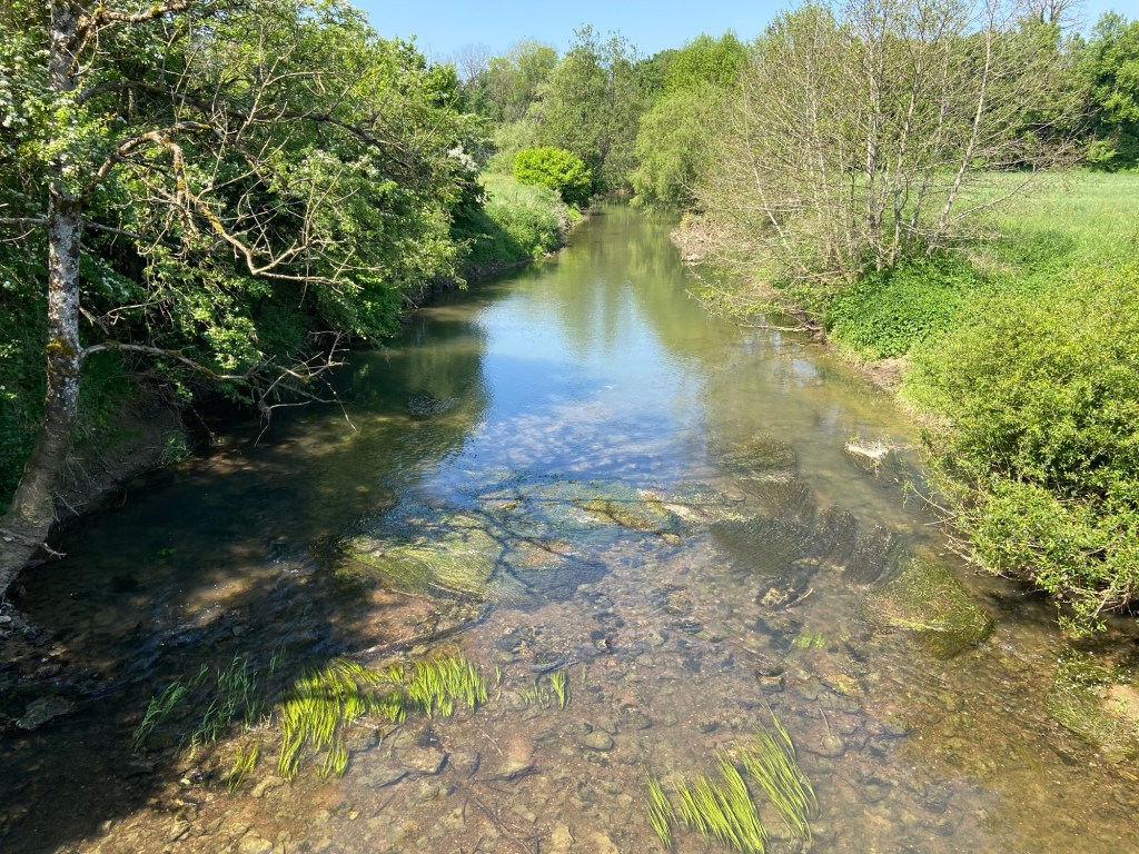 I crossed the Salon river for the first time out in the countryside. It was shallow and green, with shoals of tiny fish hiding amongst the waterweeds.  A pied wagtail hopping about on the stones flew up as I passed to flick his tail on a tree branch over the water.