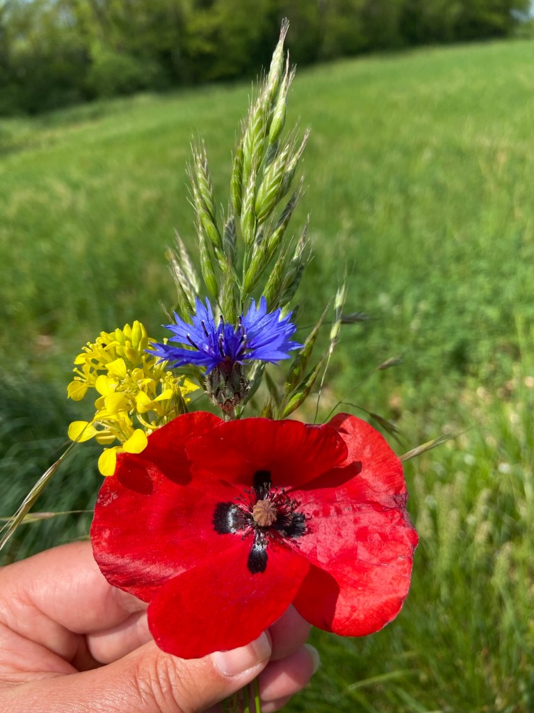 In a field sown with alfalfa were more cornflowers, scarlet poppies and some leftover or self-seeded small brassica. The random scattering of red blue and yellow was immensely pleasing.