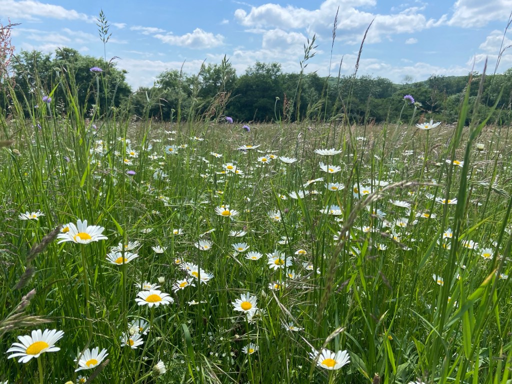 On the other was a huge expanse of wildflowers, with bright new generations of painted ladies, orange and yellow clouded yellow butterflies with black edges to their wings, two blue butterflies engaged in aerial combat. They were feeding off the scabious, the ox-eye daisies, the buttercups.  One side of the road sterile, the other a haven for the insects that in turn the birds need. If you want birds, you must have insects and if you want insects, you must have wildflowers.