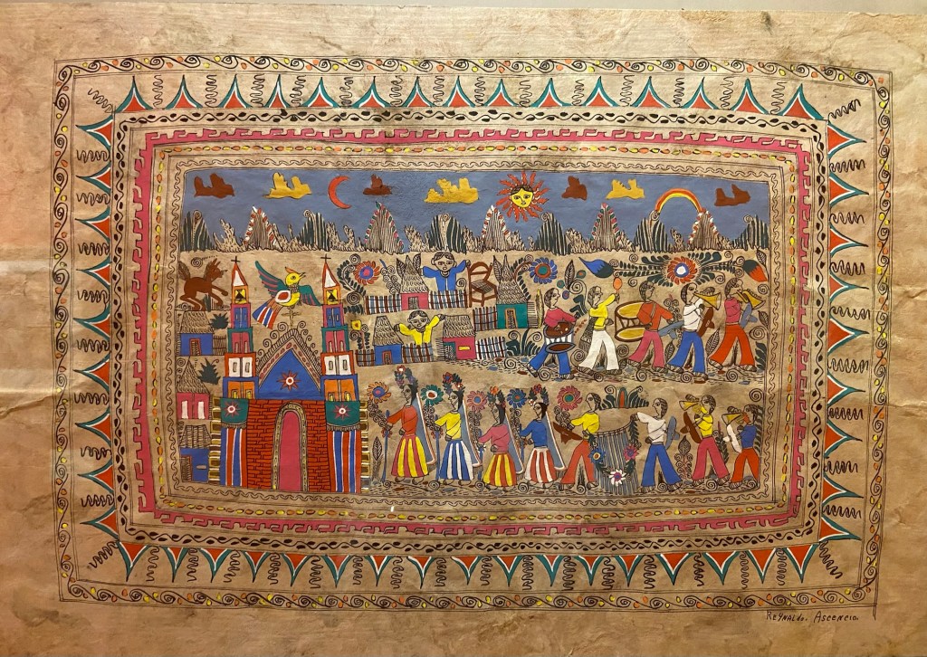 I didn’t much care for many of the permanent exhibits in the museum which were set pieces showing what an old pharmacy would’ve looked like, or a school, or a travelling fair with puppets and a small merry-go-round. It all seemed rather dusty. But the Mexican exhibits were wonderful: full of colour and energy. There were costumes, and 20th century artworks like this painting of a festival by Teynaldo Ascencio on plant fibre paper,