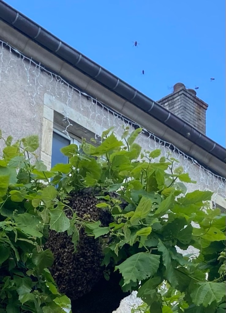 Outside, in the car park there was another swarm of bees — this one had settled in one of the municipal trees in a beautiful classic swarm shape. This (I thought) is the time of year when the old queen bees are ousted, and go travelling.