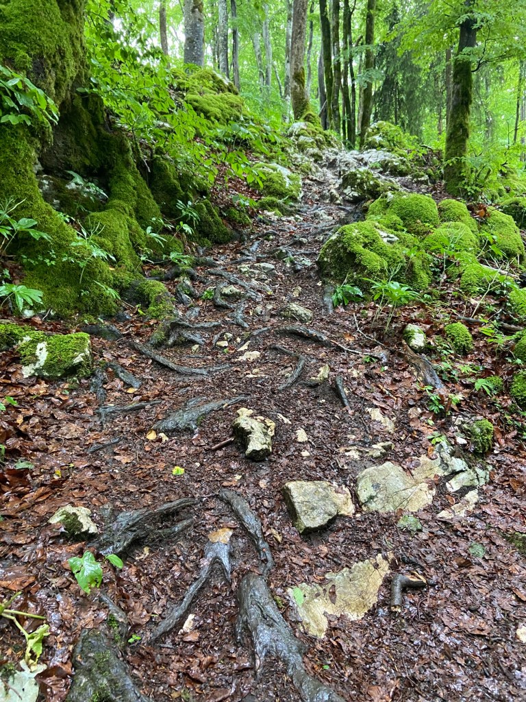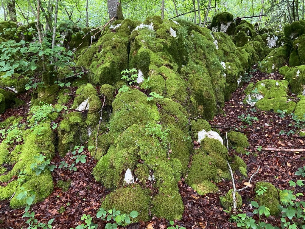 The uphill slopes were sometimes covered in limestone boulders under thick mats of moss,