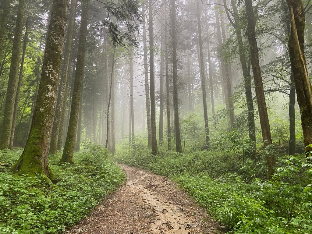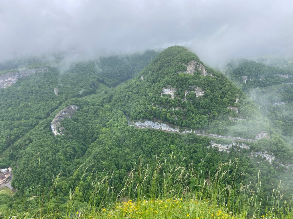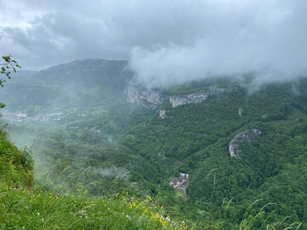 After the pit stop the path continued to climb to the highest point of today’s walk, an 879m summit which passed almost unnoticed as I was focused on the spooky clouds which filled the pine wood, turning the air as milky as the limestone did the Loue river,