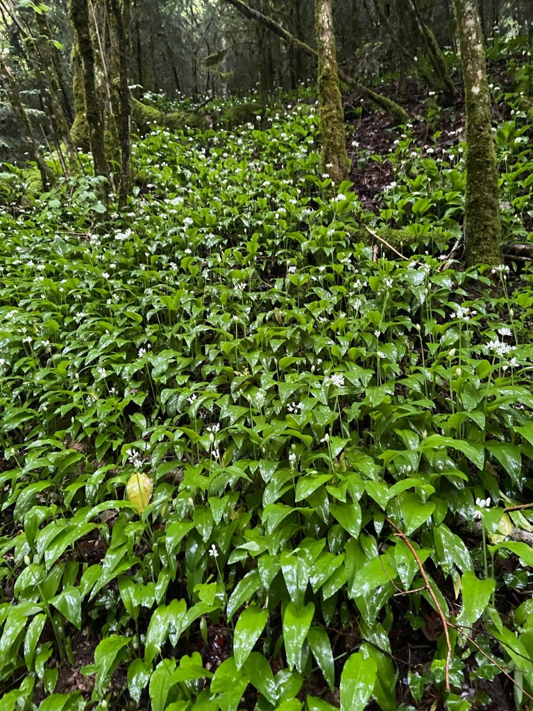 Rain fell constantly. I wasn’t particularly sheltered here, and neither was the starry wild garlic, leaves slick and shining with water, struck every so often with fat drops from the trees above so that leaves flicked in a random pattern of mesmerising movement.