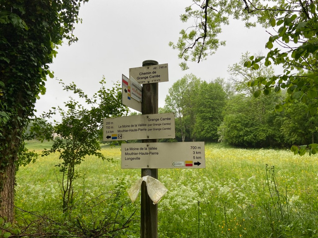 There was now a decision to make, and it was an easy one. To my left the path continued to the Source, with a potentially slippery loss in height of hundreds of meters, only to have to climb out of the gorge again to gain the village of Ouhans. To my right was the hamlet of Renédale (I could not think how the is came to be named — was it really an English toponym, tacked onto the end of a proper noun?), and an all-but-flat not to mention shorter road walk down to Ouhans. It was a no-brainier.