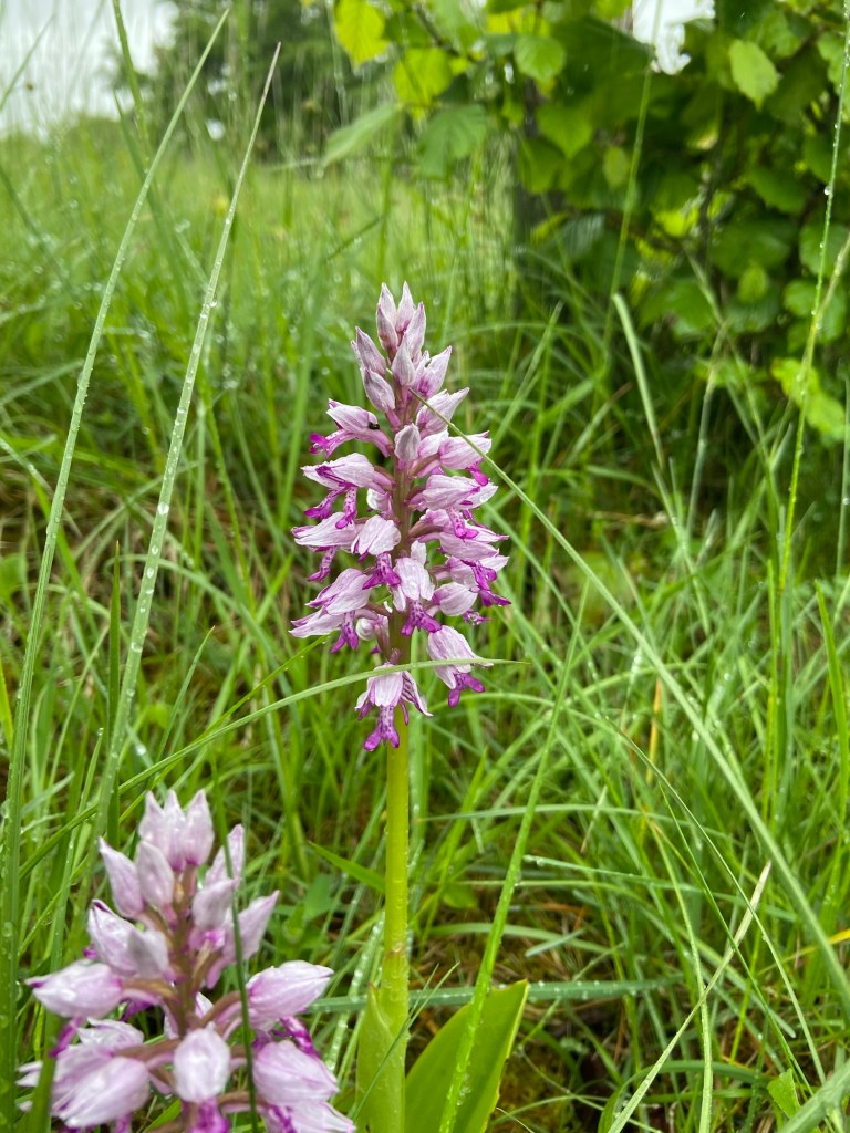 At the bottom of the hill my hands had got really quite chilly, wet from the rain and lacking the faster-pumped blood from the exertion of a climb, so much so that I was having difficulty getting my phone in and out of my pocket to take photos of monkey orchids,