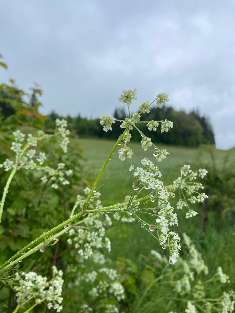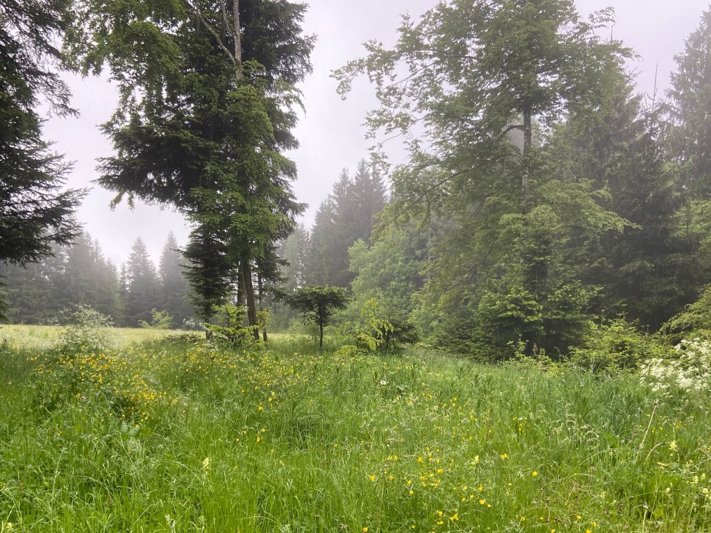 I was climbing amongst wet meadows now, which yesterday must have been waving in the hot sun and light breeze (how glad I was that I wasn’t tackling the ascents in the heat!) and which today were bowed down with the weight of water droplets. I wondered how much extra weight I was carrying in the water that was soaking me. My hands were now quite pink and warm with the exertion.