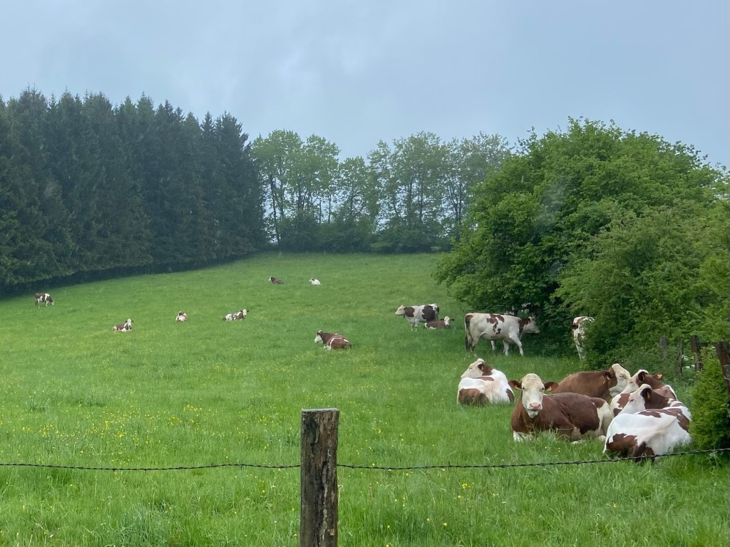 Danielle was one of those remarkable people who is just brimming with good humour and generosity. Her ready laughter seemed to banish the wet and the cold in an instant. And walking through the door into a warm house felt just blissful. We sat at the kitchen table and she offered me water and lemonade and as much bread and cheese as I could eat: three wonderful varieties, Comte and Morbier, both local to the Doubs region, and Délice de Bourgogne, a fabulously creamy cheese which I think was my favourite. I asked about the brown and white cows that I have been seeing over the past few days, and Danielle said they were called Montbéliardes — their milk is exclusively used for the Comte and Morbier cheeses (Simmental milk may be used as well). For the Comte cheese there can be no more than 1.3 cows per hectare of pasture and they must not be fed silage (in fact, sometimes the cows are fed on 100% fresh hay). Morbier is traditionally made from two kinds of curds, leftover evening curds, not enough to make a whole cheese, were traditionally spread into a mould and covered with a thin layer of ash to preserve them until the next day when curds from the morning milking were added to fill the mould and complete the cheese with its signature layer of ash running through it.
