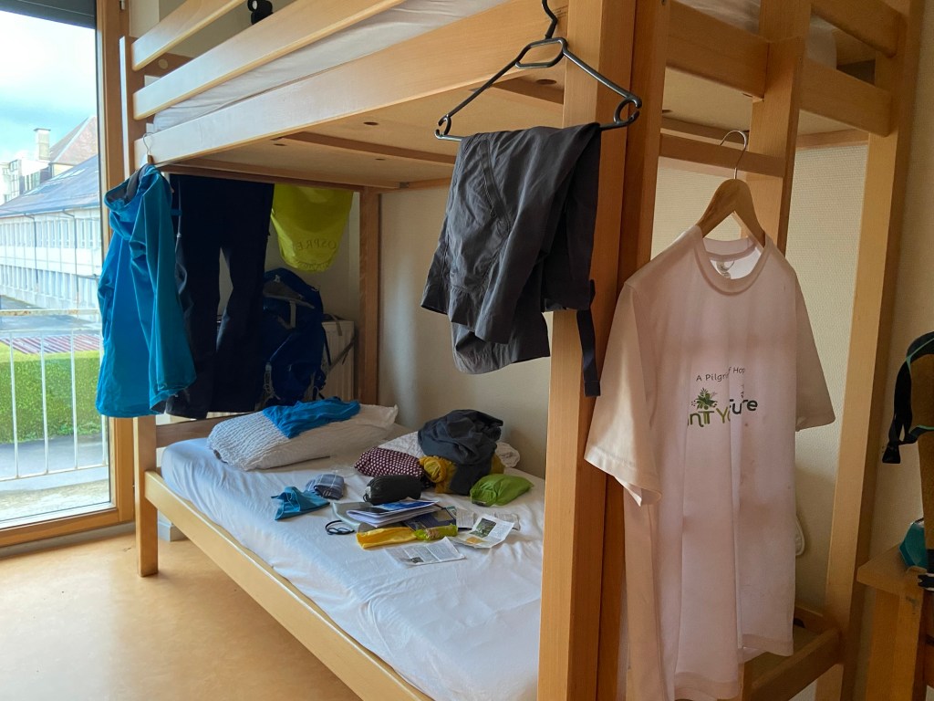 Room 17 in Pontarlier youth hostel was a four person dorm, already occupied by Aphra, a Via Francigena pilgrim from Newcastle. She had arrived yesterday and had been on a rest today, so she had not finished her day similarly sodden. I set about the business of hanging everything up to dry in creative ways to make the best use of the single but very effective radiator. My shoes dried out remarkably quickly: by the time I was thinking about supper at 7:30, socks and shoes were both dry as toast and as warm.