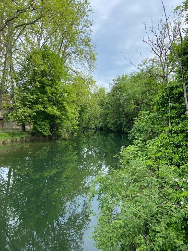 The mosaic seemed to be river-themed, and I indeed I crossed the Orbe for one final time down in the valley bottom. It was quiet and lake-like here out in the valley where it wasn’t squeezed by the sides of its gorge.